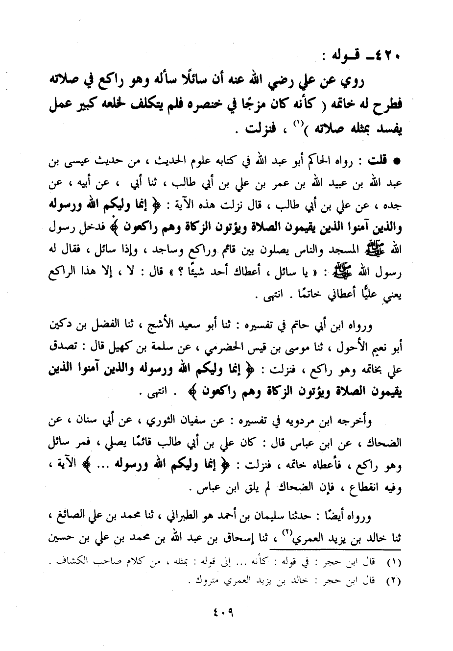 قلت رَوَاهُ الْحَاكِم أَبُو عبد الله فِي كِتَابه عُلُوم الحَدِيث من حَدِيث عِيسَى بن عبد الله بن عبيد الله بن عمر بن عَلّي بن أبي طَالب ثَنَا أبي عَن أَبِيه عَن جده عَن عَلّي بن أبي طَالب قَالَ نزلت هَذِه الْآيَة إِنَّمَا وَلِيكُم الله وَرَسُوله وَالَّذين آمنُوا الَّذين يُقِيمُونَ الصَّلَاة وَيُؤْتونَ الزَّكَاة وهم رَاكِعُونَ فَدخل رَسُول الله صَلَّى اللَّهُ عَلَيْهِ وَسَلَّم َ الْمَسْجِد وَالنَّاس يصلونَ بَين قَائِم وَرَاكِع وَسَاجِد وَإِذا سَائل فَقَالَ لَهُ رَسُول الله صَلَّى اللَّهُ عَلَيْهِ وَسَلَّم َ يَا سَائل أَعْطَاك أحد شَيْئا قَالَ لَا إِلَّا هَذَا الرَّاكِع يَعْنِي عليا أَعْطَانِي خَاتمًا انْتَهَى