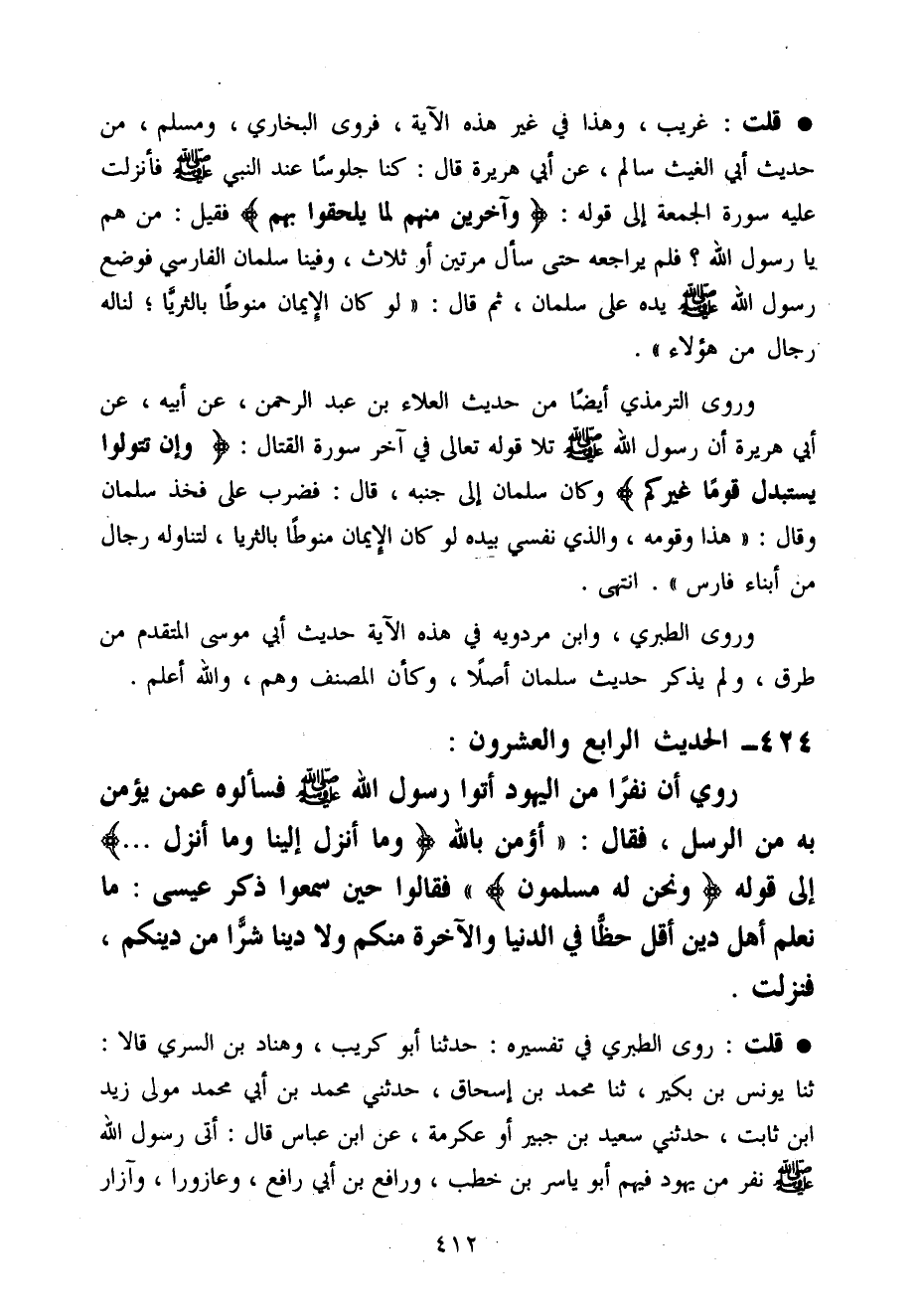 قلت غَرِيب وَهَذَا فِي غير هَذِه الْآيَة فروَى البُخَارِيّ وَمُسلم من حَدِيث أبي الْغَيْث سَالم عَن أبي هُرَيْرَة قَالَ كُنَّا جُلُوسًا عِنْد النَّبِي صَلَّى اللَّهُ عَلَيْهِ وَسَلَّم َ فأنزلت عَلَيْهِ سُورَة الْجُمُعَة إِلَى قَوْله وَآخَرين مِنْهُم لما يلْحقُوا بهم فَقيل من هم يَا رَسُول الله فَلم يُرَاجِعهُ حَتَّى سَأَلَ مرَّتَيْنِ أَو ثَلَاث وَفينَا سلمَان الْفَارِسِي فَوضع رَسُول الله صَلَّى اللَّهُ عَلَيْهِ وَسَلَّم َ يَده عَلَى سلمَان ثمَّ قَالَ لَو كَانَ الْإِيمَان مَنُوطًا بِالثُّرَيَّا لَنَالَهُ رجال من هَؤُلَاءِ