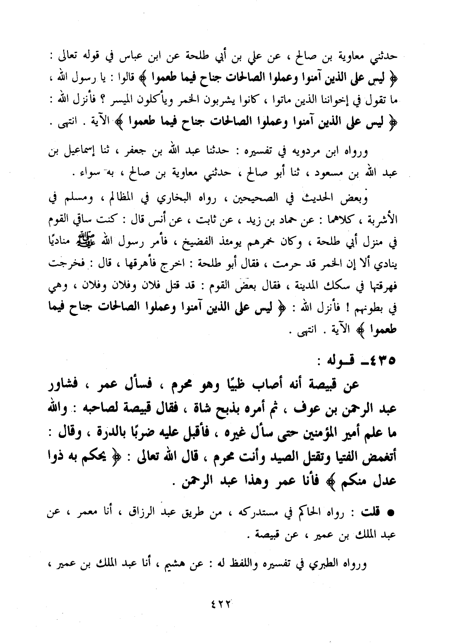 حَدثنِي مُعَاوِيَة بن صَالح عَن عَلّي بن أبي طَلْحَة عَن ابْن عَبَّاس فِي قَوْله تَعَالَى لَيْسَ عَلَى الَّذين آمنُوا وَعمِلُوا الصَّالِحَات جنَاح فِيمَا طعموا قَالُوا يَا رَسُول الله مَا تَقول فِي إِخْوَاننَا الَّذين مَاتُوا كَانُوا يشربون الْخمر ويأكلون الميسر فَأنْزل الله لَيْسَ عَلَى الَّذين آمنُوا وَعمِلُوا الصَّالِحَات جنَاح فِيمَا طعموا الْآيَة انْتَهَى