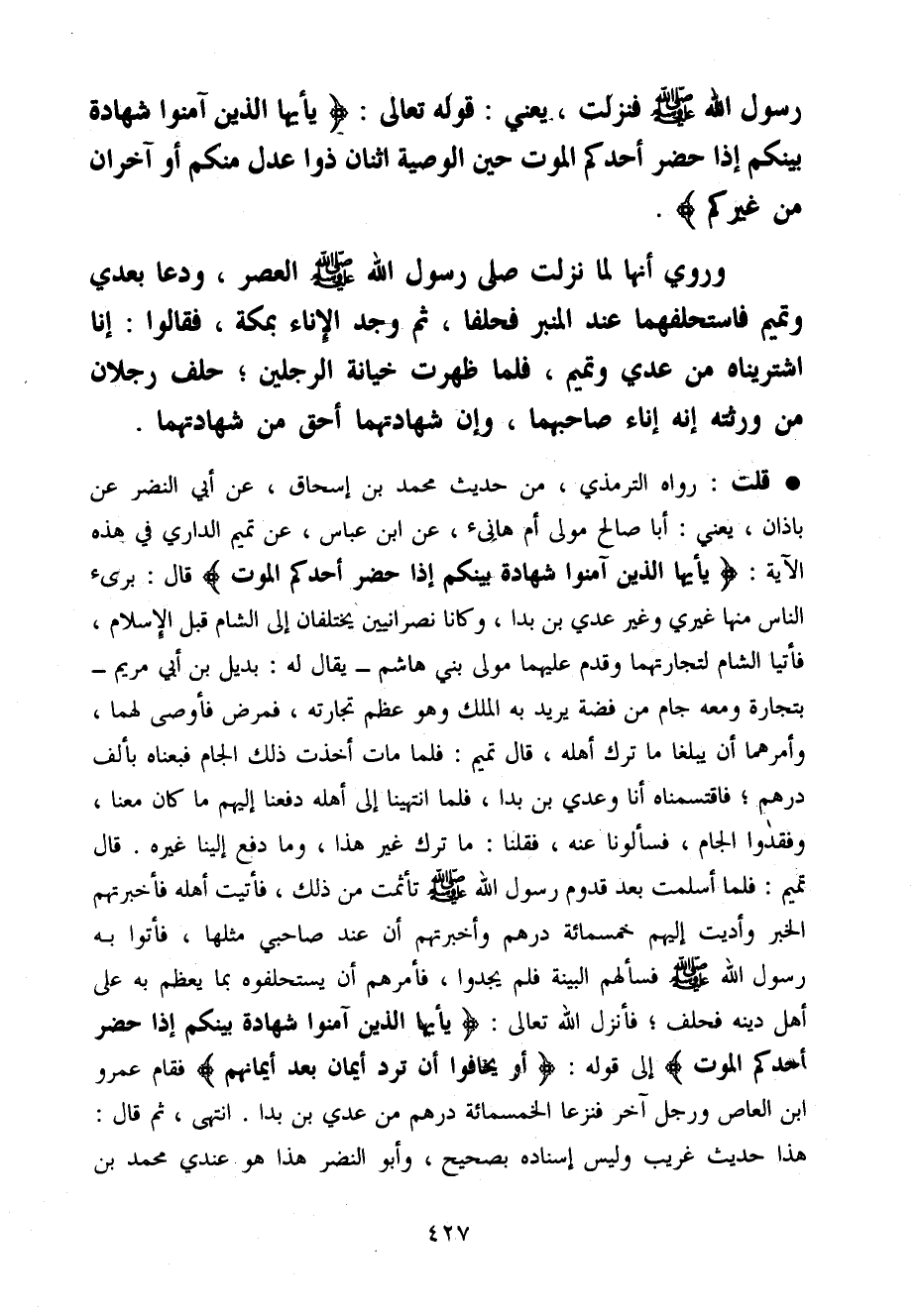 قلت رَوَاهُ التِّرْمِذِيّ من حَدِيث مُحَمَّد بن إِسْحَاق عَن أبي النَّضر عَن باذان يَعْنِي أَبَا صَالح مولَى أم هَانِئ عَن ابْن عَبَّاس عَن تَمِيم الدَّارِيّ فِي هَذِه الْآيَة يأيها الَّذين آمنُوا شَهَادَة بَيْنكُم إِذا حضر أحدكُم الْمَوْت قَالَ برِئ النَّاس مِنْهَا غَيْرِي وَغير عدي بن بدا وَكَانَا نَصْرَانِيين يَخْتَلِفَانِ إِلَى الشَّام قبل الْإِسْلَام فَأتيَا الشَّام لِتِجَارَتِهِمَا وَقدم عَلَيْهِمَا مولَى بني هَاشم يُقَال لَهُ بديل بن أبي مَرْيَم بِتِجَارَة وَمَعَهُ جَام من فضَّة يُرِيد بِهِ الْملك وَهُوَ عظم تِجَارَته فَمَرض فَأَوْصَى لَهما وَأَمرهمَا أَن يبلغَا مَا ترك أَهله قَالَ تَمِيم فَلَمَّا مَاتَ أخذت ذَلِك الْجَام فَبِعْنَاهُ بِأَلف دِرْهَم فاقتسمناه أَنا وعدي بن بدا فَلَمَّا انتهينا إِلَى أَهله دفعنَا إِلَيْهِم مَا كَانَ مَعنا وَفقدُوا الْجَام فَسَأَلُونَا عَنهُ فَقُلْنَا مَا ترك غير هَذَا وَمَا دفع إِلَيْنَا غَيره قَالَ تَمِيم فَلَمَّا أسلمت بعد قدوم رَسُول الله صَلَّى اللَّهُ عَلَيْهِ وَسَلَّم َ تَأَثَّمت من ذَلِك فَأتيت أَهله فَأَخْبَرتهمْ الْخَبَر وَأديت إِلَيْهِم خَمْسمِائَة دِرْهَم وَأَخْبَرتهمْ أَن عِنْد صَاحِبي مثلهَا فَأتوا بِهِ رَسُول الله صَلَّى اللَّهُ عَلَيْهِ وَسَلَّم َ فَسَأَلَهُمْ الْبَيِّنَة فَلم يَجدوا فَأَمرهمْ أَن يَسْتَحْلِفُوهُ بِمَا يعظم بِهِ عَلَى أهل دينه فَحلف فَأنْزل الله تَعَالَى يأيها الَّذين آمنُوا شَهَادَة بَيْنكُم إِذا حضر أحدكُم الْمَوْت إِلَى قَوْله أَو يخَافُوا أَن ترد أَيْمَان بعد أَيْمَانهم فَقَامَ عَمْرو ابْن الْعَاصِ وَرجل آخر فَنَزَعَا الْخَمْسمِائَةِ دِرْهَم من عدي بن بدا انْتَهَى ثمَّ قَالَ هَذَا حَدِيث غَرِيب وَلَيْسَ إِسْنَاده بِصَحِيح وَأَبُو النَّضر هَذَا هُوَ عِنْدِي مُحَمَّد بن