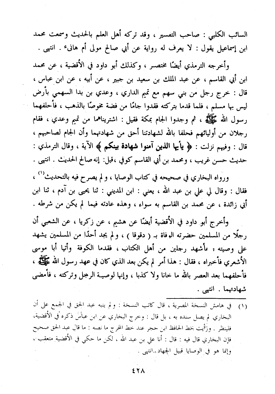 وَأخرجه التِّرْمِذِيّ أَيْضا مُخْتَصر وَكَذَلِكَ أَبُو دَاوُد فِي الْأَقْضِيَة عَن مُحَمَّد ابْن أبي الْقَاسِم عَن عبد الْملك بن سعيد بن جُبَير عَن أَبِيه عَن ابْن عَبَّاس قَالَ خرج رجل من بني سهم مَعَ تَمِيم الدَّارِيّ وعدي بن بدا السَّهْمِي بِأَرْض لَيْسَ بهَا مُسلم فَلَمَّا قدما بِتركَتِهِ فقدوا جَاما من فضَّة مخوضًا بِالذَّهَب فَأَحْلفهُمَا رَسُول الله صَلَّى اللَّهُ عَلَيْهِ وَسَلَّم َ ثمَّ وجدوا الْجَام بِمَكَّة فَقيل اشتريناهما من تَمِيم وعدي فَقَامَ رجلَانِ من أَوْلِيَائِهِمْ فَحَلفا بِاللَّه لَشَهَادَتنَا أَحَق من شَهَادَتهمَا وَأَن الْجَام لصَاحِبِهِمْ قَالَ وَفِيهِمْ نزلت يأيها الَّذين آمنُوا شَهَادَة بَيْنكُم الْآيَة وَقَالَ التِّرْمِذِيّ حَدِيث حسن غَرِيب وَمُحَمّد بن أبي الْقَاسِم كُوفِي قيل إِنَّه صَالح الحَدِيث انْتَهَى