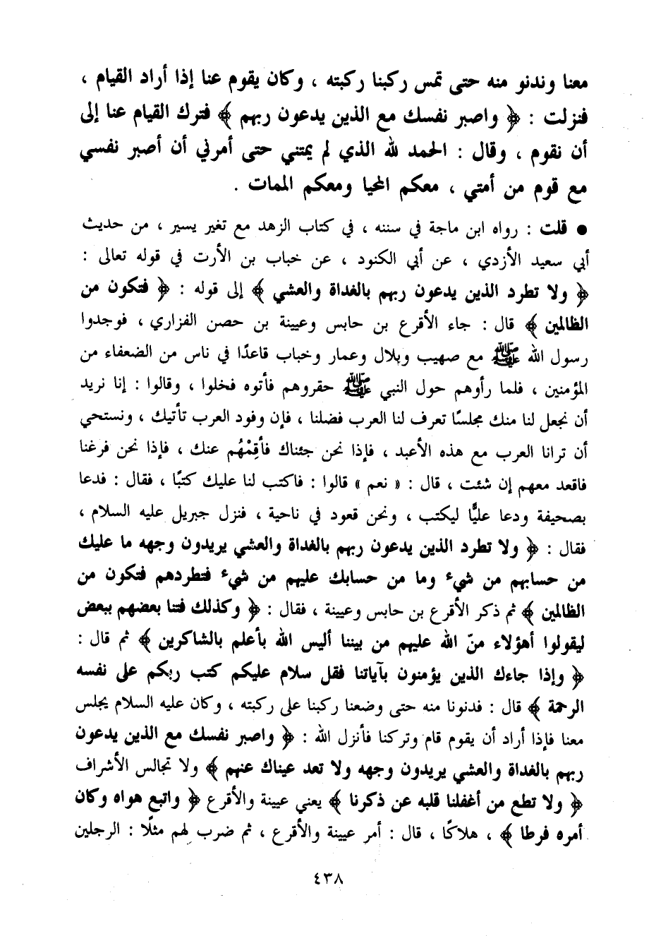 قلت رَوَاهُ ابْن ماجة فِي سنَنه فِي كتاب الزّهْد مَعَ تغير يسير من حَدِيث أبي سعيد الْأَزْدِيّ عَن أبي الكنود عَن خباب بن الْأَرَت فِي قَوْله تَعَالَى وَلَا تطرد الَّذين يدعونَ رَبهم بِالْغَدَاةِ والعشي إِلَى قَوْله فَتكون من الظَّالِمين قَالَ جَاءَ الْأَقْرَع بن حَابِس وعيينة بن حصن الْفَزارِيّ فوجدوا رَسُول الله صَلَّى اللَّهُ عَلَيْهِ وَسَلَّم َ مَعَ صُهَيْب وبلال وعمار وخباب قَاعِدا فِي نَاس من الضُّعَفَاء من الْمُؤمنِينَ فَلَمَّا رَأَوْهُمْ حول النَّبِي صَلَّى اللَّهُ عَلَيْهِ وَسَلَّم َ حَقرُوهُمْ فَأتوهُ فَخلوا وَقَالُوا إِنَّا نُرِيد أَن نجْعَل لنا مِنْك مَجْلِسا تعرف لنا الْعَرَب فضلنَا فَإِن وُفُود الْعَرَب تَأْتِيك ونستحي أَن تَرَانَا الْعَرَب مَعَ هَذِه الْأَعْبد فَإِذا نَحن جئْنَاك فأقمهم عَنْك فَإِذا نَحن فَرغْنَا فَاقْعُدْ مَعَهم إِن شِئْت قَالَ نعم قَالُوا فَاكْتُبْ لنا عَلَيْك كتبا فَقَالَ دَعَا بِصَحِيفَة ودعا عليا ليكتب وَنحن قعُود فِي نَاحيَة فَنزل جِبْرِيل عَلَيْهِ السَّلَام فَقَالَ (وَلَا تطرد الَّذين يدعونَ رَبهم بِالْغَدَاةِ والعشي يُرِيدُونَ وَجهه مَا عَلَيْك من حسابهم من شَيْء وَمَا من حِسَابك عَلَيْهِم من شَيْء فَتَطْرُدهُمْ فَتكون من الظَّالِمين) ثمَّ ذكر الْأَقْرَع بن حَابِس وعيينة فَقَالَ وَكَذَلِكَ فتنا بَعضهم بِبَعْض لِيَقُولُوا أَهَؤُلَاءِ من الله عَلَيْهِم من بَيْننَا أَلَيْسَ الله بِأَعْلَم بِالشَّاكِرِينَ ثمَّ قَالَ وَإِذا جَاءَك الَّذين يُؤمنُونَ بِآيَاتِنَا فَقل سَلام عَلَيْكُم كتب ربكُم عَلَى نَفسه الرَّحْمَة قَالَ فَدَنَوْنَا مِنْهُ حَتَّى وَضعنَا ركبنَا عَلَى ركبته وَكَانَ عَلَيْهِ السَّلَام يجلس مَعنا فَإِذا أَرَادَ أَن يقوم قَامَ وَتَركنَا فَأنْزل الله واصبر نَفسك مَعَ الَّذين يدعونَ رَبهم بِالْغَدَاةِ والعشي يُرِيدُونَ وَجهه وَلَا تعد عَيْنَاك عَنْهُم وَلَا تجَالس الْأَشْرَاف وَلَا تُطِع من أَغْفَلنَا قلبه عَن ذكرنَا يَعْنِي عُيَيْنَة والأقرع وَاتبع هَوَاهُ وَكَانَ أمره فرطا هَلَاكًا قَالَ أَمر عُيَيْنَة والأقرع ثمَّ ضرب لَهُم مثلا الرجلَيْن