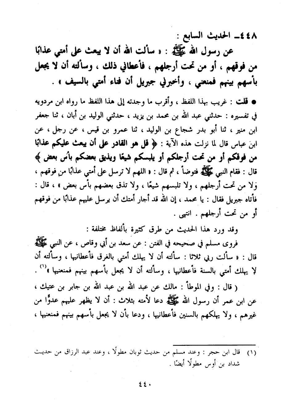 فروَى مُسلم فِي صَحِيحه فِي الْفِتَن عَن سعد بن أبي وَقاص عَن النَّبِي صَلَّى اللَّهُ عَلَيْهِ وَسَلَّم َ قَالَ سَأَلت رَبِّي ثَلَاثًا سَأَلته أَن لَا يهْلك أمتِي بِالْغَرَقِ فَأَعْطَانِيهَا وَسَأَلته أَن لَا يهْلك أمتِي بِالسنةِ فَأَعْطَانِيهَا وَسَأَلته أَن لَا يَجْعَل بأسهم بَينهم فَمَنَعَنِيهَا