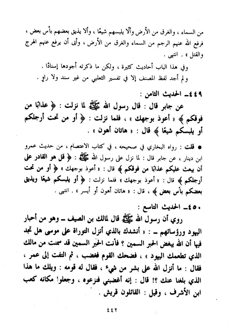 قلت رَوَاهُ البُخَارِيّ فِي صَحِيحه فِي كتاب الِاعْتِصَام من حَدِيث عَمْرو ابْن دِينَار عَن جَابر قَالَ لما نزل عَلَى رَسُول الله صَلَّى اللَّهُ عَلَيْهِ وَسَلَّم َ قل هُوَ الْقَادِر عَلَى أَن يبْعَث عَلَيْكُم عذَابا من فَوْقكُم قَالَ أعوذ بِوَجْهِك أَو من تَحت أَرْجُلكُم قَالَ أعوذ بِوَجْهِك فَلَمَّا نزلت (أَو يلْبِسكُمْ شيعًا وَيُذِيق بَعْضكُم بَأْس بعض) قَالَ هَاتَانِ أَهْون أَو أيسر انْتَهَى