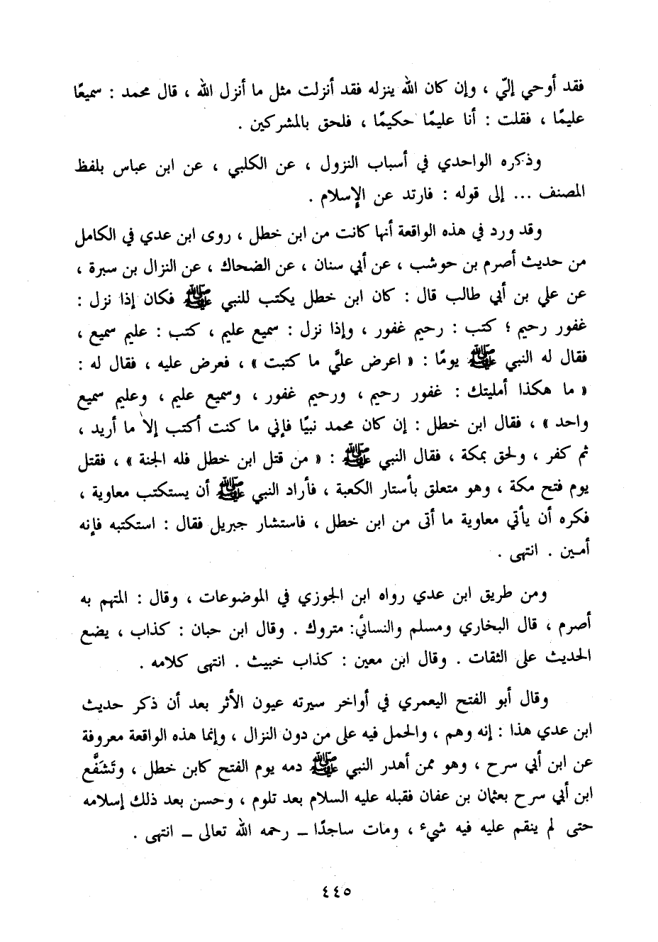 فقد أُوحِي إِلَيّ وَإِن كَانَ الله ينزله فقد أنزلت مثل مَا أنزل الله قَالَ مُحَمَّد سميعا عليما فَقلت أَنا عليما حكيما فلحق بالمشركين