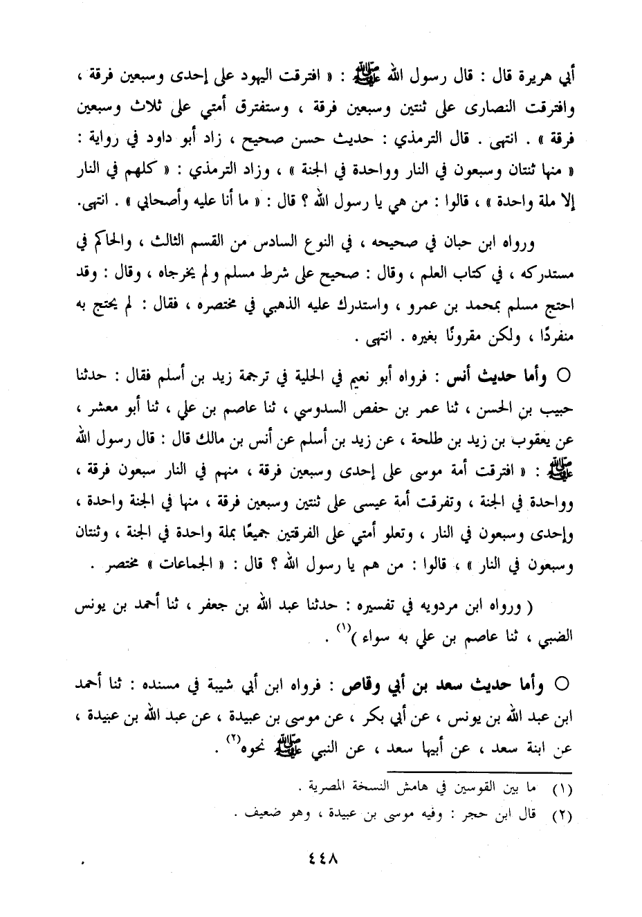 أبي هُرَيْرَة قَالَ قَالَ رَسُول الله صَلَّى اللَّهُ عَلَيْهِ وَسَلَّم َ افْتَرَقت الْيَهُود عَلَى إِحْدَى وَسبعين فرقة وافترقت النَّصَارَى عَلَى ثِنْتَيْنِ وَسبعين فرقة وَسَتَفْتَرِقُ أمتِي عَلَى ثَلَاث وَسبعين فرقة انْتَهَى قَالَ التِّرْمِذِيّ حَدِيث حسن صَحِيح زَاد أَبُو دَاوُد فِي رِوَايَة مِنْهَا ثِنْتَانِ وَسَبْعُونَ فِي النَّار وَوَاحِدَة فِي الْجنَّة وَزَاد التِّرْمِذِيّ كلهم فِي النَّار إِلَّا مِلَّة وَاحِدَة قَالُوا من هِيَ يَا رَسُول الله قَالَ مَا أَنا عَلَيْهِ وأصحابي انْتَهَى
