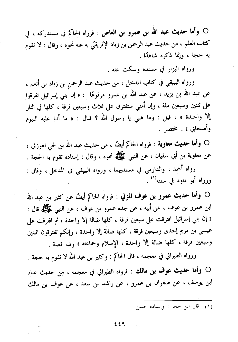 وَأما حَدِيث عَمْرو بن عَوْف الْمُزنِيّ فَرَوَاهُ الْحَاكِم أَيْضا عَن كثير بن عبد الله ابْن عَمْرو بن عَوْف عَن أَبِيه عَن جده عَمْرو بن عَوْف عَن النَّبِي صَلَّى اللَّهُ عَلَيْهِ وَسَلَّم َ قَالَ إِن بني إِسْرَائِيل افْتَرَقت عَلَى سبعين فرقة كلهَا ضَالَّة إِلَّا وَاحِدَة ثمَّ افْتَرَقت عَلَى عِيسَى بن مَرْيَم إِحْدَى وَسبعين فرقة كلهَا ضَالَّة إِلَّا وَاحِدَة وَإِنَّكُمْ تَفْتَرِقُونَ اثْنَتَيْنِ وَسبعين فرقة كلهَا ضَالَّة إِلَّا وَاحِدَة الْإِسْلَام وجماعته وَفِيه قصَّة