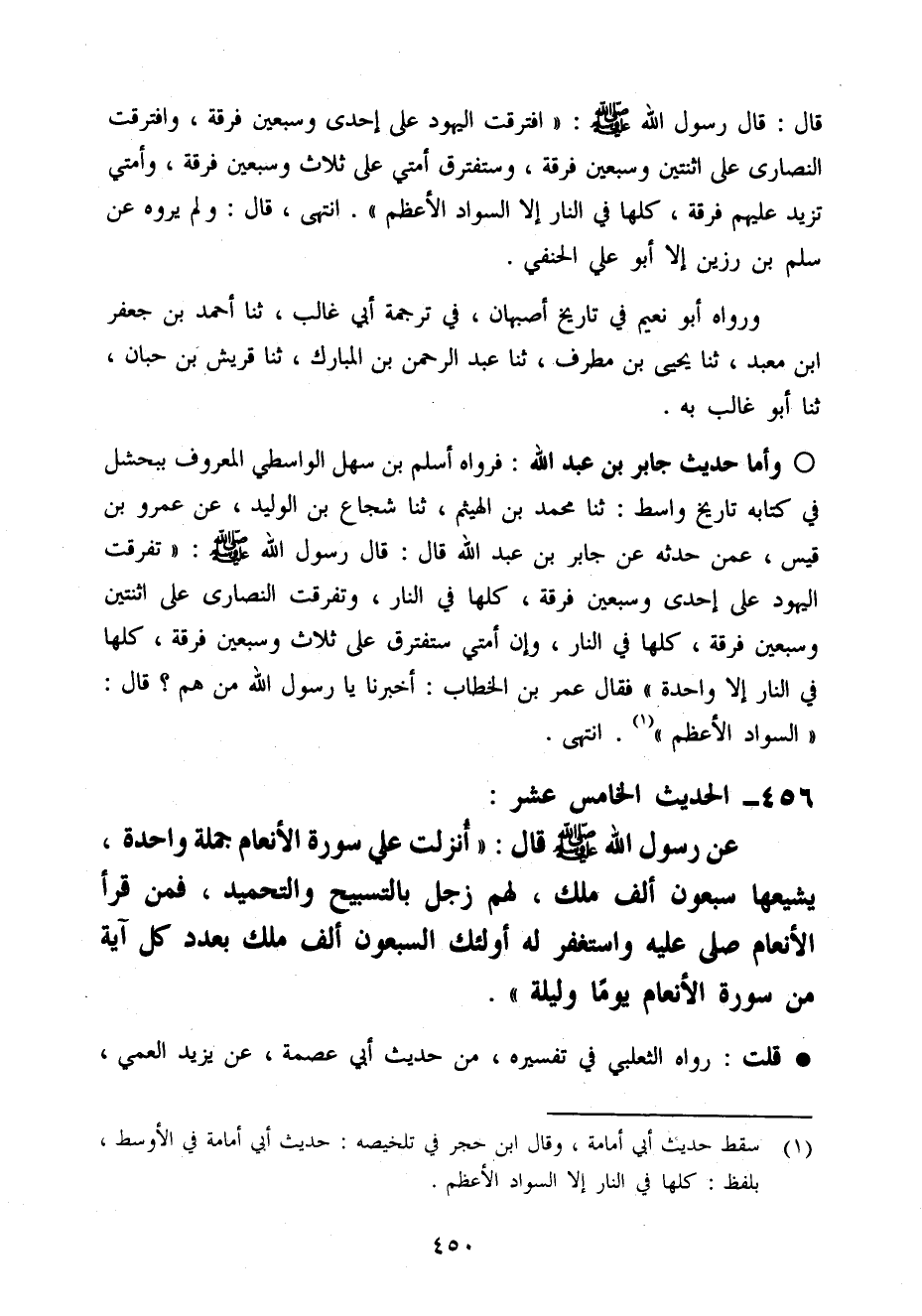 وَأما حَدِيث جَابر بن عبد الله فَرَوَاهُ أسلم بن سهل الوَاسِطِيّ الْمَعْرُوف بِبَحْشَلٍ فِي كِتَابه تَارِيخ وَاسِط ثَنَا مُحَمَّد بن الْهَيْثَم ثَنَا شُجَاع بن الْوَلِيد عَن عَمْرو بن قيس عَمَّن حَدثهُ عَن جَابر بن عبد الله قَالَ قَالَ رَسُول الله صَلَّى اللَّهُ عَلَيْهِ وَسَلَّم َ تَفَرَّقت الْيَهُود عَلَى إِحْدَى وَسبعين فرقة كلهَا فِي النَّار وَتَفَرَّقَتْ النَّصَارَى عَلَى اثْنَتَيْنِ وَسبعين فرقة كلهَا فِي النَّار وَإِن أمتِي سَتَفْتَرِقُ عَلَى ثَلَاث وَسبعين فرقة كلهَا فِي النَّار إِلَّا وَاحِدَة فَقَالَ عمر بن الْخطاب أخبرنَا يَا رَسُول الله من هم قَالَ السوَاد الْأَعْظَم انْتَهَى