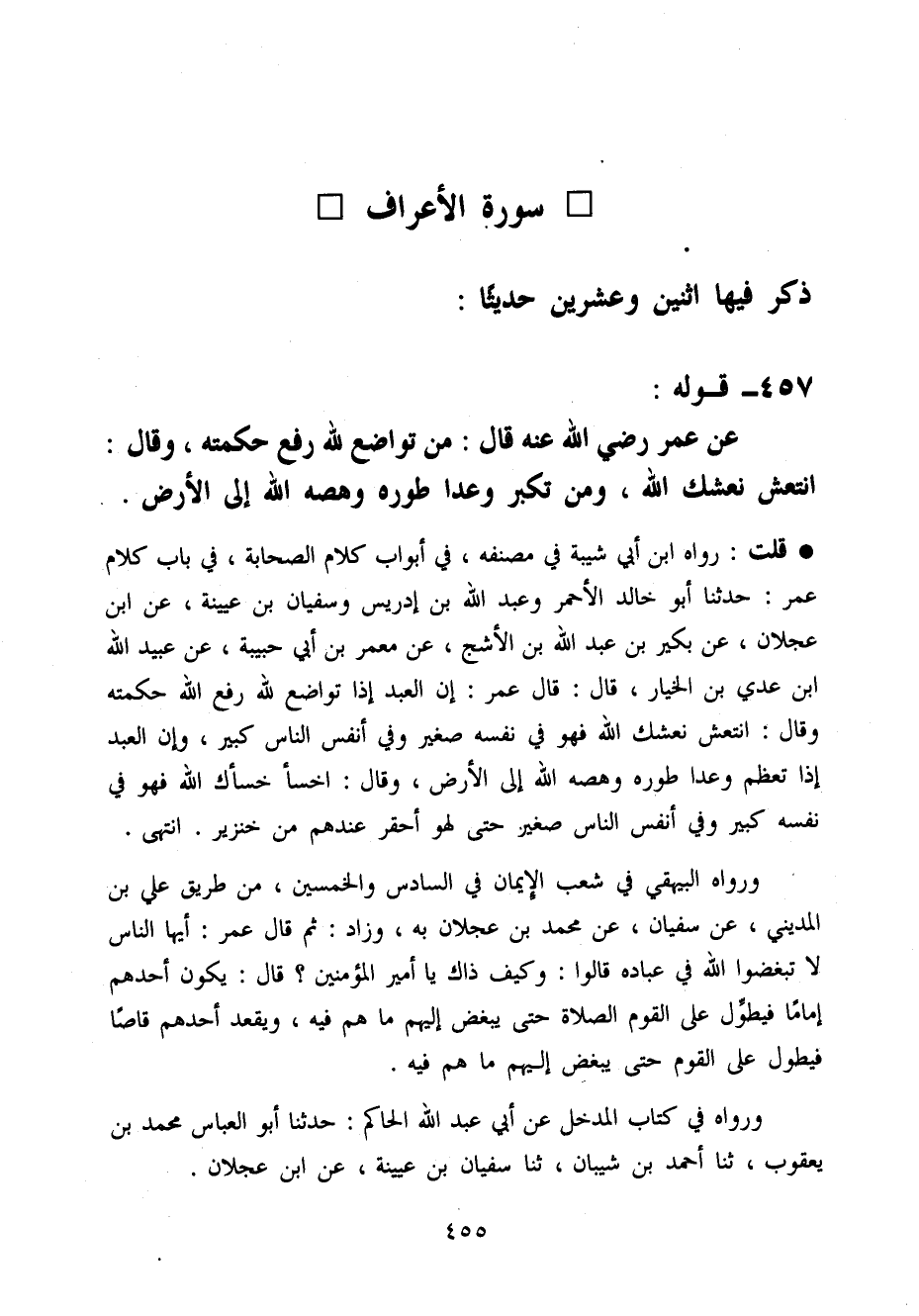 قلت رَوَاهُ ابْن أبي شيبَة فِي مُصَنفه فِي أَبْوَاب كَلَام الصَّحَابَة فِي بَاب كَلَام عمر حَدثنَا أَبُو خَالِد الْأَحْمَر وَعبد الله بن إِدْرِيس وسُفْيَان بن عُيَيْنَة عَن ابْن عجلَان عَن بكير بن عبد الله بن الْأَشَج عَن معمر بن أبي حَبِيبَة عَن عبيد الله ابْن عدي بن الْخِيَار قَالَ قَالَ عمر إِن العَبْد إِذا تواضع لله رفع الله حكمته وَقَالَ انْتَعش نَعشك الله فَهُوَ فِي نَفسه صَغِير وَفِي أنفس النَّاس كَبِير وَإِن العَبْد إِذا تعظم وَعدا طوره وهصه الله إِلَى الأَرْض وَقَالَ اخْسَأْ خسأك الله فَهُوَ فِي نَفسه كَبِير وَفِي أنفس النَّاس صَغِير حَتَّى لَهو أَحْقَر عِنْدهم من خِنْزِير انْتَهَى