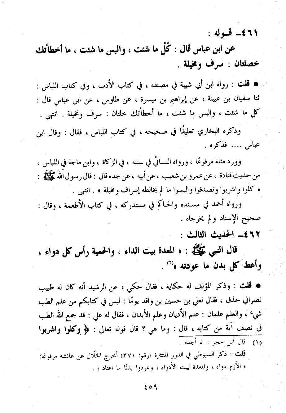 قلت رَوَاهُ ابْن أبي شيبَة فِي مُصَنفه فِي كتاب الْأَدَب وَفِي كتاب اللبَاس ثَنَا سُفْيَان بن عُيَيْنَة عَن إِبْرَاهِيم بن ميسرَة عَن طَاوس عَن ابْن عَبَّاس قَالَ كل مَا شِئْت والبس مَا شِئْت مَا أَخْطَأتك خلَّتَانِ سرف ومخيلة انْتَهَى