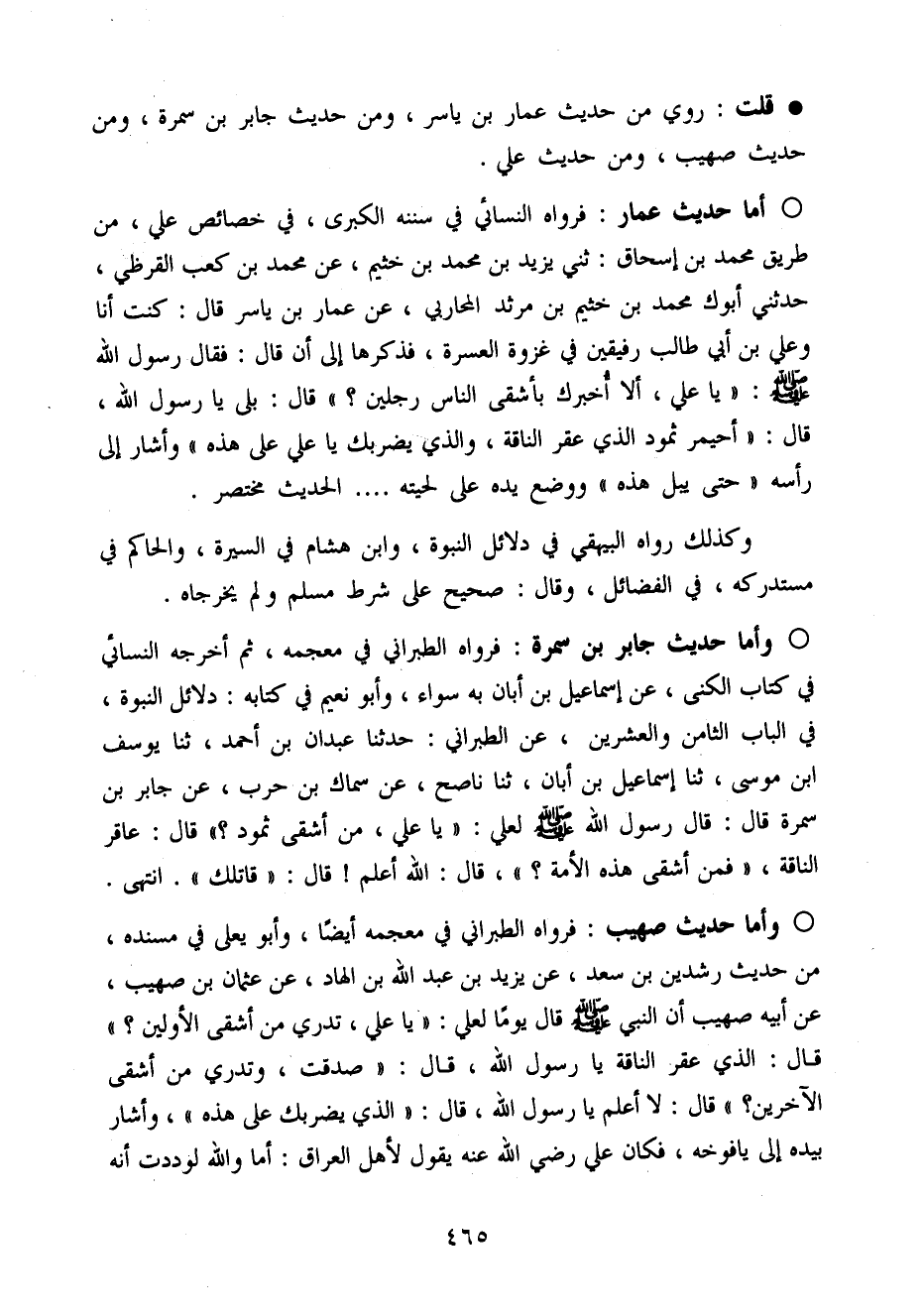 أما حَدِيث عمار فَرَوَاهُ النَّسَائِيّ فِي سنَنه الْكُبْرَى فِي خَصَائِص عَلّي من طَرِيق مُحَمَّد بن إِسْحَاق ثني يزِيد بن مُحَمَّد بن خثيم عَن مُحَمَّد بن كَعْب الْقرظِيّ حَدثنِي أَبوك مُحَمَّد بن خثيم بن مرْثَد الْمحَاربي عَن عمار بن يَاسر قَالَ كنت أَنا وَعلي بن أبي طَالب رَفِيقَيْنِ فِي غَزْوَة الْعسرَة فَذكرهَا إِلَى أَن قَالَ فَقَالَ رَسُول الله صَلَّى اللَّهُ عَلَيْهِ وَسَلَّم َ يَا عَلّي أَلا أخْبرك بِأَشْقَى النَّاس رجلَيْنِ قَالَ بلَى يَا رَسُول الله قَالَ أُحَيْمِر ثَمُود الَّذِي عقر النَّاقة وَالَّذِي يَضْرِبك يَا عَلّي عَلَى هَذِه وَأَشَارَ إِلَى رَأسه حَتَّى يبل هَذِه وَوضع يَده عَلَى لحيته ... الحَدِيث مُخْتَصر