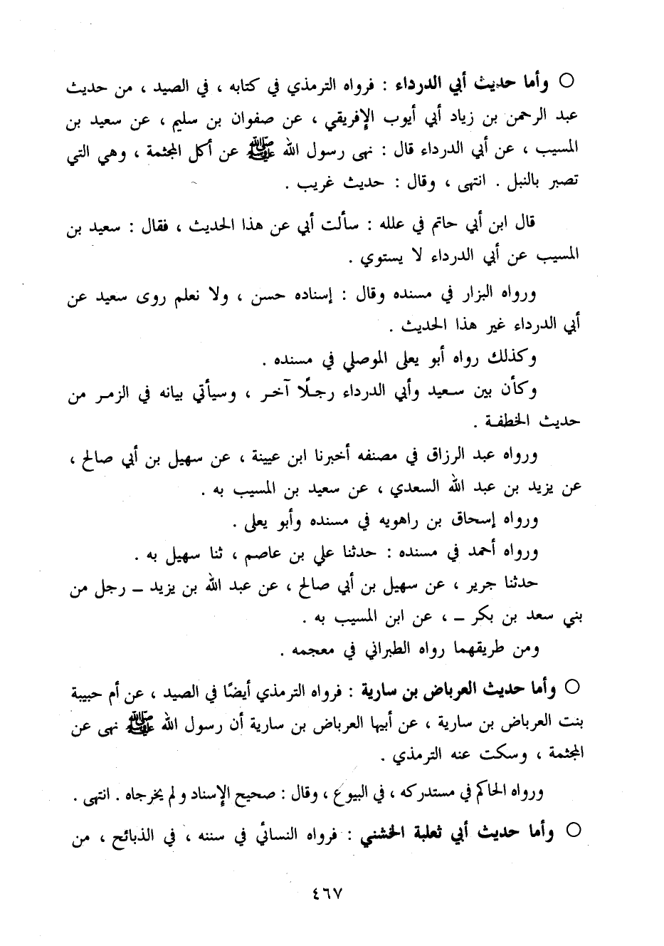 وَأما حَدِيث أبي الدَّرْدَاء فَرَوَاهُ التِّرْمِذِيّ فِي كِتَابه فِي الصَّيْد من حَدِيث عبد الرَّحْمَن بن زِيَاد أبي أَيُّوب الإفْرِيقِي عَن صَفْوَان بن سليم عَن سعيد بن الْمسيب عَن أبي الدَّرْدَاء قَالَ نهَى رَسُول الله صَلَّى اللَّهُ عَلَيْهِ وَسَلَّم َ عَن أكل الْمُجثمَة وَهِي الَّتِي تصبر بِالنَّبلِ انْتَهَى وَقَالَ حَدِيث غَرِيب