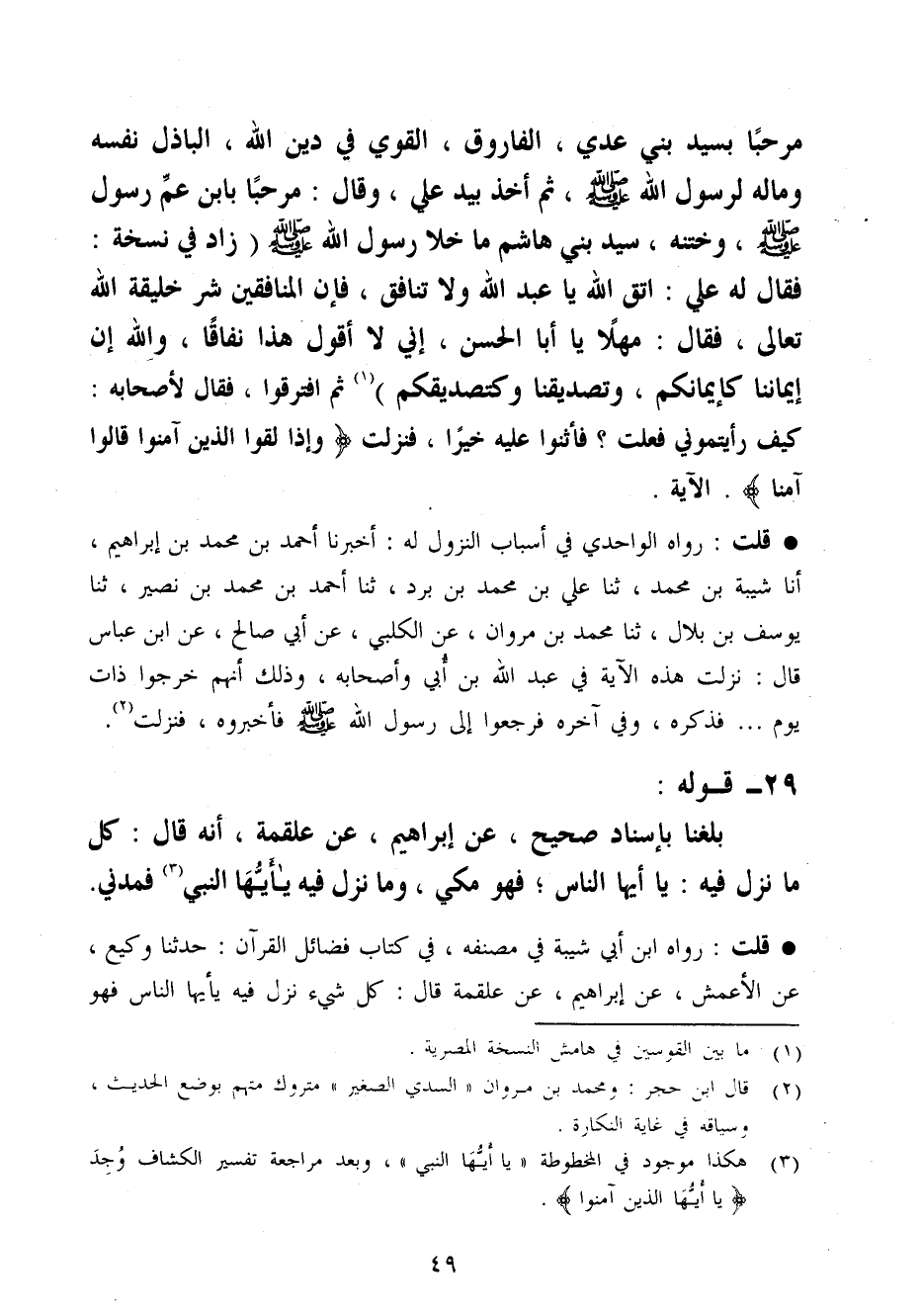 مرْحَبًا بِسَيِّد بني عدي الْفَارُوق الْقوي فِي دين الله الْبَاذِل نَفسه وَمَاله لرَسُول الله صَلَّى اللَّهُ عَلَيْهِ وَسَلَّم َ ثمَّ أَخذ بيد عَلّي وَقَالَ مرْحَبًا بِابْن عَم رَسُول صَلَّى اللَّهُ عَلَيْهِ وَسَلَّم َ وَخَتنه سيد بني هَاشم مَا خلا رَسُول الله صَلَّى اللَّهُ عَلَيْهِ وَسَلَّم َ زَاد فِي نُسْخَة فَقَالَ لَهُ عَلّي اتَّقِ الله يَا عبد الله وَلَا تُنَافِق فَإِن الْمُنَافِقين شَرّ خَلِيقَة الله تَعَالَى فَقَالَ مهلا يَا أَبَا الْحسن إِنِّي لَا أَقُول هَذَا نفَاقًا وَالله إِن إيمَاننَا كإيمانكم وَتَصْدِيقنَا وكتصديقكم ثمَّ افْتَرَقُوا فَقَالَ لأَصْحَابه كَيفَ رَأَيْتُمُونِي فعلت فَأَثْنوا عَلَيْهِ خيرا فَنزلت وَإِذا لقوا الَّذين آمنُوا قَالُوا آمنا الْآيَة