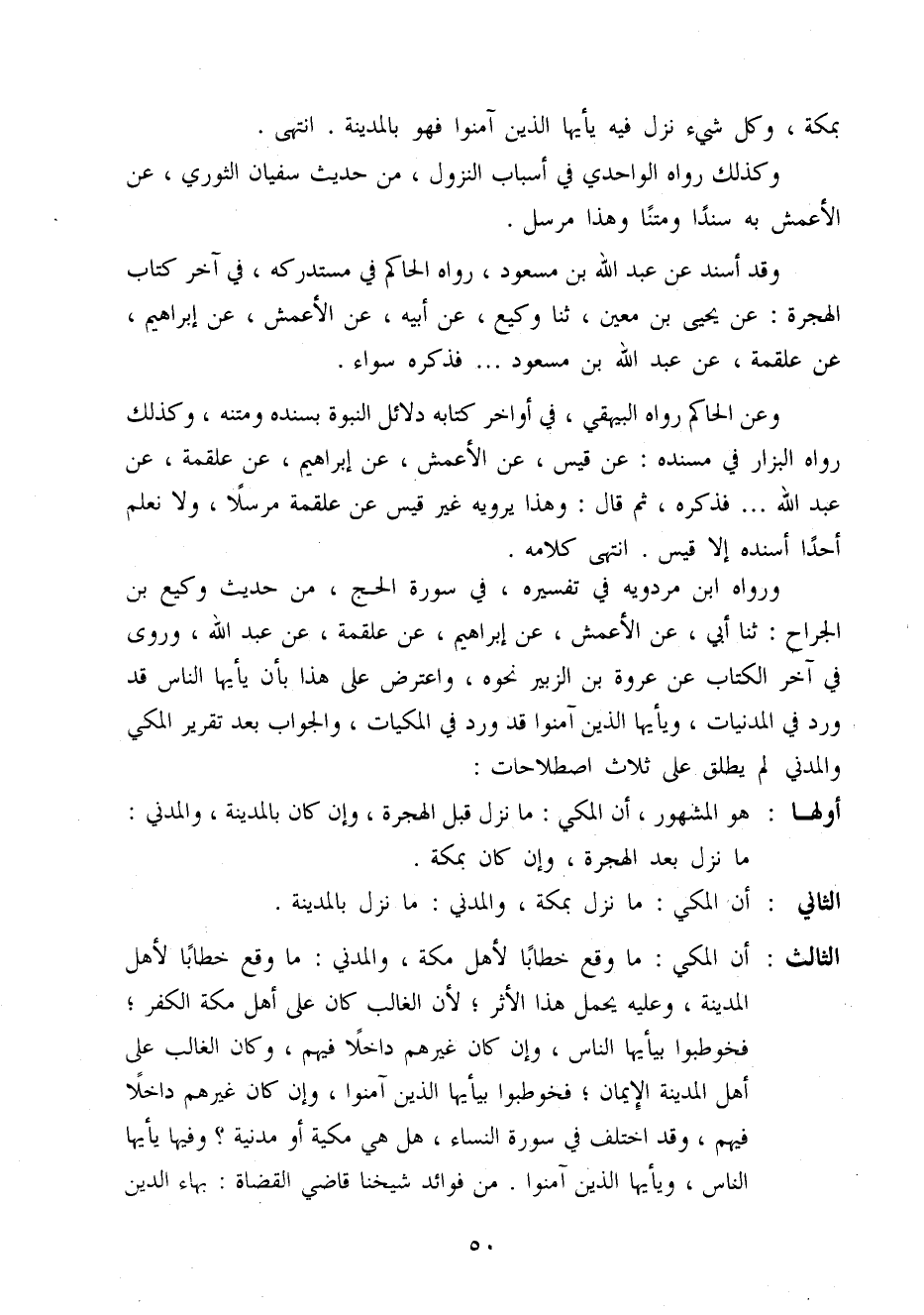 الثَّالِث أَن الْمَكِّيّ مَا وَقع خطابا لأهل مَكَّة وَالْمَدَنِي مَا وَقع خطابا لأهل الْمَدِينَة وَعَلِيهِ يحمل هَذَا الْأَثر لِأَن الْغَالِب كَانَ عَلَى أهل مَكَّة الْكفْر فَخُوطِبُوا بـ (يأيها النَّاس) وَإِن كَانَ غَيرهم دَاخِلا فيهم وَكَانَ الْغَالِب عَلَى أهل الْمَدِينَة الْإِيمَان فَخُوطِبُوا بـ (يأيها الَّذين آمنُوا) وَإِن كَانَ غَيرهم دَاخِلا فيهم وَقد اخْتلف فِي سُورَة النِّسَاء هَل هِيَ مَكِّيَّة أَو مَدَنِيَّة وفيهَا يأيها النَّاس ويأيها الَّذين آمنُوا من فَوَائِد شَيخنَا قَاضِي الْقُضَاة بهاء الدَّين