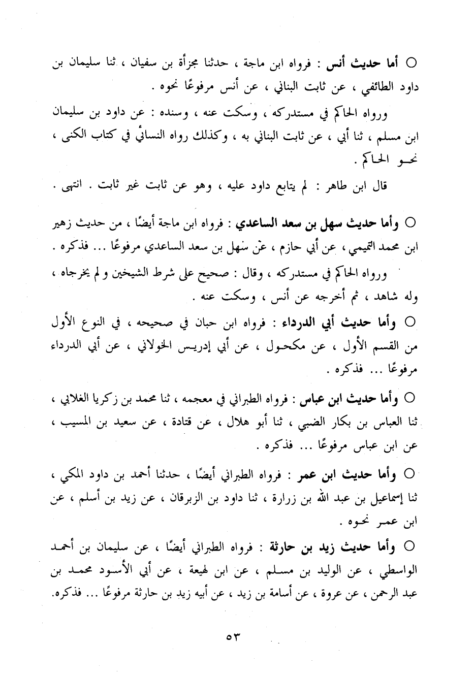 وَأما حَدِيث زيد بن حَارِثَة فَرَوَاهُ الطَّبَرَانِيّ أَيْضا عَن سُلَيْمَان بن أَحْمد الوَاسِطِيّ عَن الْوَلِيد بن مُسلم عَن ابْن لَهِيعَة عَن أبي الْأسود مُحَمَّد بن عبد الرَّحْمَن عَن عُرْوَة عَن أُسَامَة بن زيد عَن أَبِيه زيد بن حَارِثَة مَرْفُوعا ... فَذكره