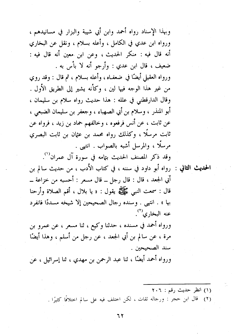 الحَدِيث الثَّانِي رَوَاهُ أَبُو دَاوُد فِي سنَنه فِي كتاب الْأَدَب من حَدِيث سَالم بن أبي الْجَعْد قَالَ قَالَ رجل قَالَ مسعر أَحْسبهُ من خُزَاعَة - قَالَ سَمِعت النَّبِي صَلَّى اللَّهُ عَلَيْهِ وَسَلَّم َ يَقُول يَا بِلَال أقِم الصَّلَاة وَأَرِحْنَا بهَا انْتَهَى وَسَنَده رجال الصَّحِيحَيْنِ إِلَّا شَيْخه مُسَددًا فَانْفَرد عَنهُ البُخَارِيّ وَرَوَاهُ أَحْمد فِي مُسْنده حَدثنَا وَكِيع ثَنَا مسعر عَن عَمْرو بن مرّة عَن سَالم بن أبي الْجَعْد عَن رجل من أسلم وَهَذَا أَيْضا سَنَد صَحِيحَيْنِ وَرَوَاهُ أَحْمد أَيْضا ثَنَا عبد الرَّحْمَن بن مهْدي ثَنَا إِسْرَائِيل عَن