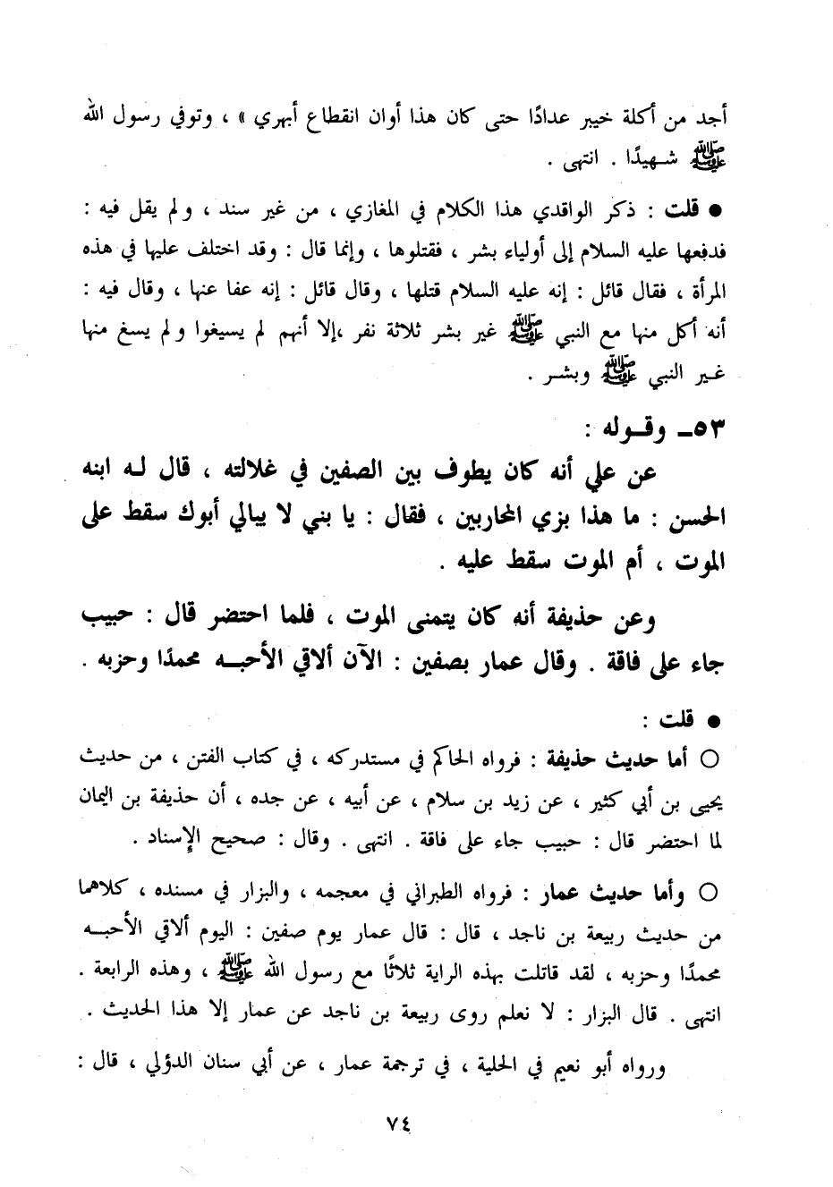 وَأما حَدِيث عمار فَرَوَاهُ الطَّبَرَانِيّ فِي مُعْجَمه وَالْبَزَّار فِي مُسْنده كِلَاهُمَا من حَدِيث ربيعَة بن ناجد قَالَ قَالَ عمار يَوْم صفّين الْيَوْم أُلَاقِي الْأَحِبَّة مُحَمَّدًا وَحزبه لقد قَاتَلت بِهَذِهِ الرَّايَة ثَلَاثًا مَعَ رَسُول الله صَلَّى اللَّهُ عَلَيْهِ وَسَلَّم َ وَهَذِه الرَّابِعَة انْتَهَى قَالَ الْبَزَّار لَا نعلم رَوَى ربيعَة بن ناجد عَن عمار إِلَّا هَذَا الحَدِيث
