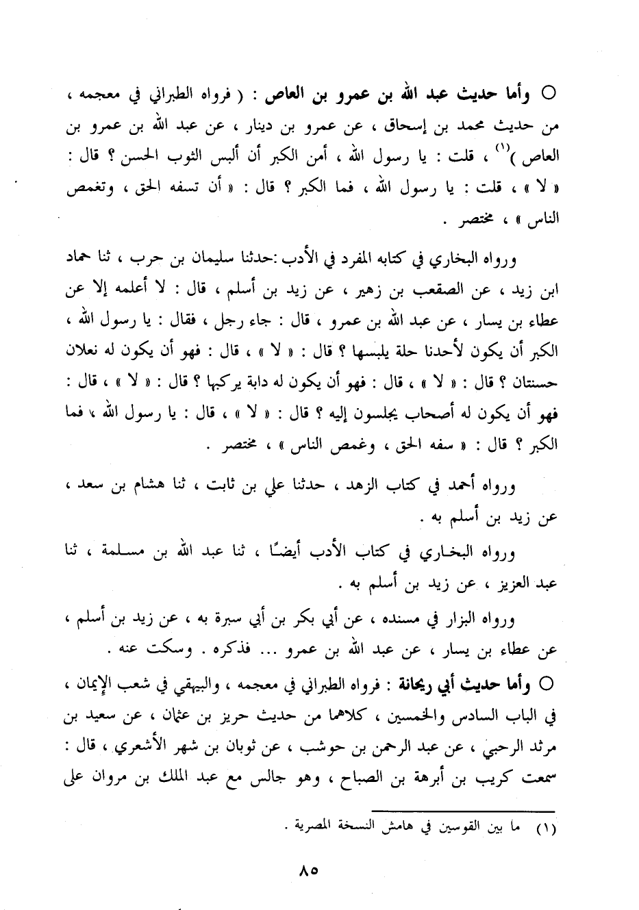 وَرَوَاهُ البُخَارِيّ فِي كِتَابه الْمُفْرد فِي الْأَدَب حَدثنَا سُلَيْمَان بن حَرْب ثَنَا حَمَّاد ابْن زيد عَن الصعب بن زُهَيْر عَن زيد بن أسلم قَالَ لَا أعلمهُ إِلَّا عَن عَطاء بن يسَار عَن عبد الله بن عَمْرو قَالَ جَاءَ الرجل فَقَالَ يَا رَسُول الله الْكبر أَن يكون لِأَحَدِنَا حلَّة يلبسهَا قَالَ لَا قَالَ فَهُوَ أَن يكون لَهُ نَعْلَانِ حَسَنَتَانِ قَالَ لَا قَالَ فَهُوَ أَن يكون لَهُ دَابَّة يركبهَا قَالَ لَا قَالَ فَهُوَ أَن يكون لَهُ أَصْحَاب يَجْلِسُونَ إِلَيْهِ قَالَ لَا قَالَ يَا رَسُول الله فَمَا الْكبر قَالَ سفه الْحق وَغَمص النَّاس مُخْتَصر