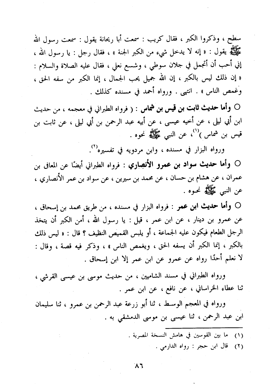 سطح وَذكروا الْكبر فَقَالَ كريب سَمِعت أَبَا رَيْحَانَة يَقُول سَمِعت رَسُول الله صَلَّى اللَّهُ عَلَيْهِ وَسَلَّم َ يَقُول إِنَّه لَا يدْخل شَيْء من الْكبر الْجنَّة فَقَالَ رجل يَا رَسُول الله إِنِّي أحب أَن أَتَجَمَّل فِي جلان سَوْطِي وَشسع نَعْلي فَقَالَ عَلَيْهِ الصَّلَاة وَالسَّلَامُ إِن ذَلِك لَيْسَ بِالْكبرِ إِن الله جميل يحب الْجمال إِنَّمَا الْكبر من سفه الْحق وَغَمص النَّاس انْتَهَى وَرَوَاهُ أَحْمد فِي مُسْنده كَذَلِك
