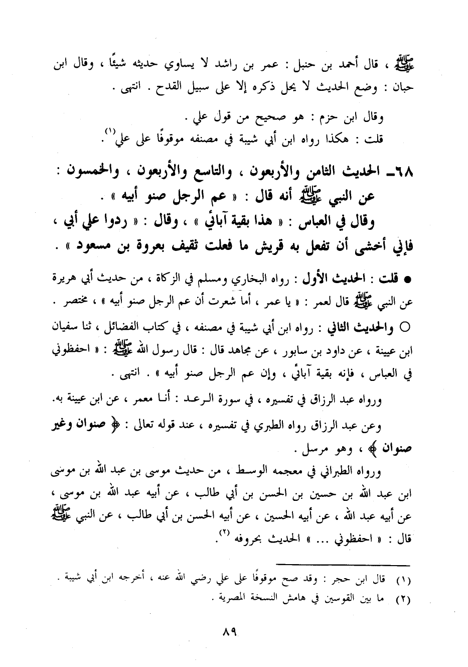 والْحَدِيث الثَّانِي رَوَاهُ ابْن أبي شيبَة فِي مُصَنفه فِي كتاب الْفَضَائِل ثَنَا سُفْيَان ابْن عُيَيْنَة عَن دَاوُد بن سَابُور عَن مُجَاهِد قَالَ قَالَ رَسُول الله صَلَّى اللَّهُ عَلَيْهِ وَسَلَّم َ احْفَظُونِي فِي الْعَبَّاس فَإِنَّهُ بَقِيَّة آبَائِي وَإِن عَم الرجل صنو أَبِيه انْتَهَى