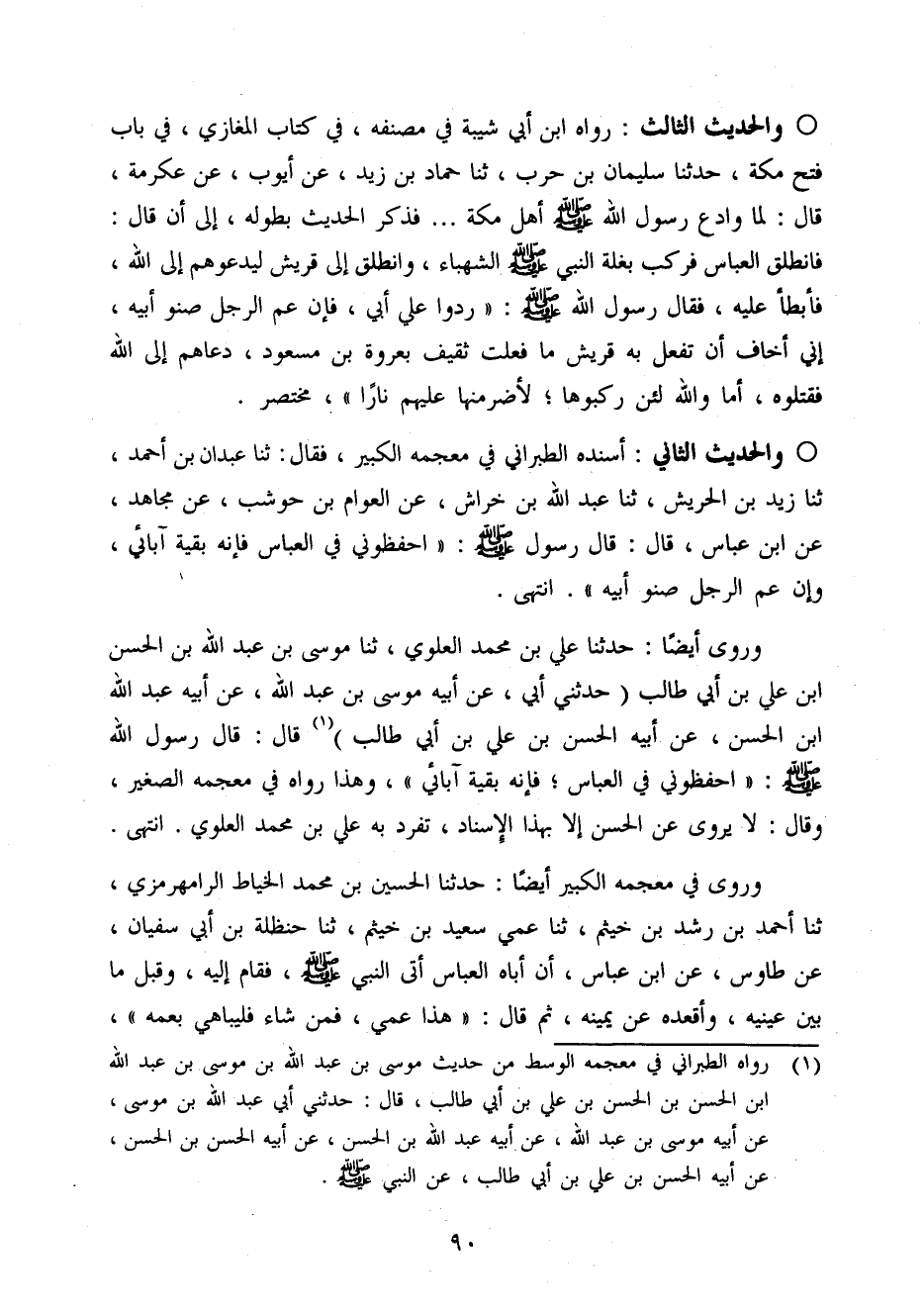والْحَدِيث الثَّالِث رَوَاهُ ابْن أبي شيبَة فِي مُصَنفه فِي كتاب الْمَغَازِي فِي بَاب فتح مَكَّة حَدثنَا سُلَيْمَان بن حَرْب ثَنَا حَمَّاد بن زيد عَن أَيُّوب عَن عِكْرِمَة قَالَ لما وادع رَسُول الله صَلَّى اللَّهُ عَلَيْهِ وَسَلَّم َ أهل مَكَّة ... فَذكر الحَدِيث بِطُولِهِ إِلَى أَن قَالَ فَانْطَلق الْعَبَّاس فَركب بغلة النَّبِي صَلَّى اللَّهُ عَلَيْهِ وَسَلَّم َ الشَّهْبَاء وَانْطَلق إِلَى قُرَيْش لِيَدْعُوهُمْ إِلَى الله فَأَبْطَأَ عَلَيْهِ فَقَالَ رَسُول الله صَلَّى اللَّهُ عَلَيْهِ وَسَلَّم َ ردوا عَلَى أبي فَإِن عَم الرجل صنو أَبِيه إِنِّي أَخَاف أَن تفعل بِهِ قُرَيْش مَا فعلت ثَقِيف بِعُرْوَة بن مَسْعُود دعاهم إِلَى الله فَقَتَلُوهُ أما وَالله لَئِن رَكبُوهَا لأضْرِمَنَّهَا عَلَيْهِم نَارا مُخْتَصر