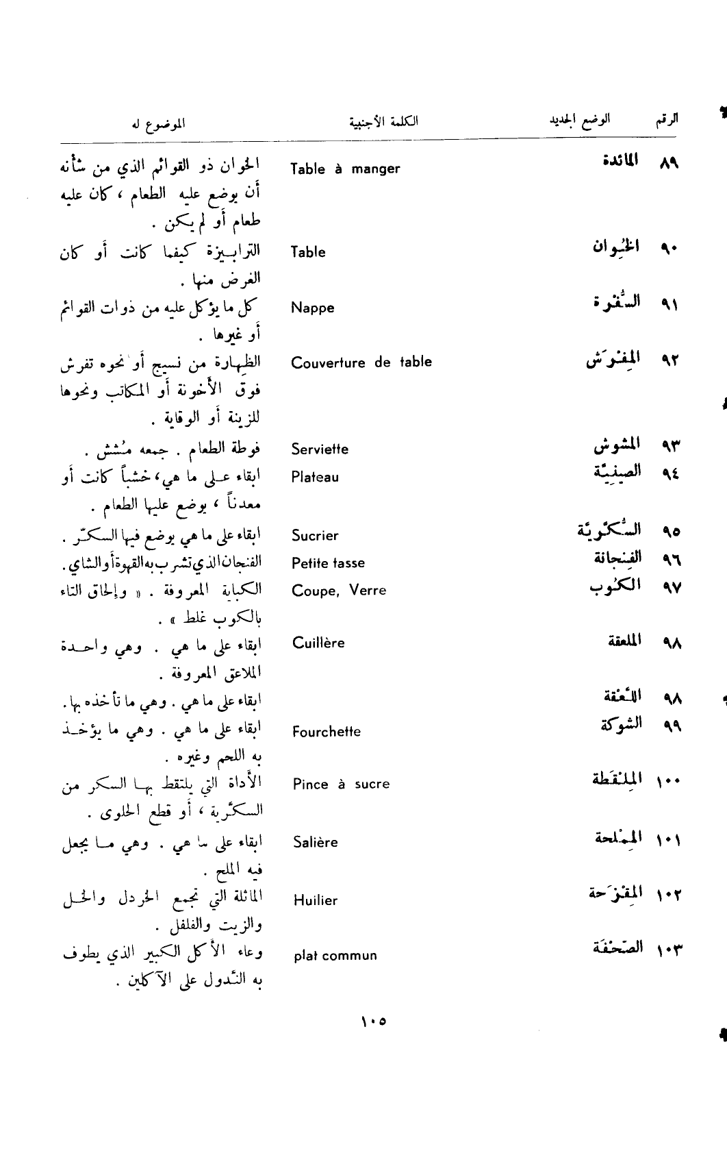 89 ... المائدة ... Table a manger ... الخوان ذو القوائم الذي من شأنه أن يوضع عليه الطعام، كان عليه طعام أو لم يكن.