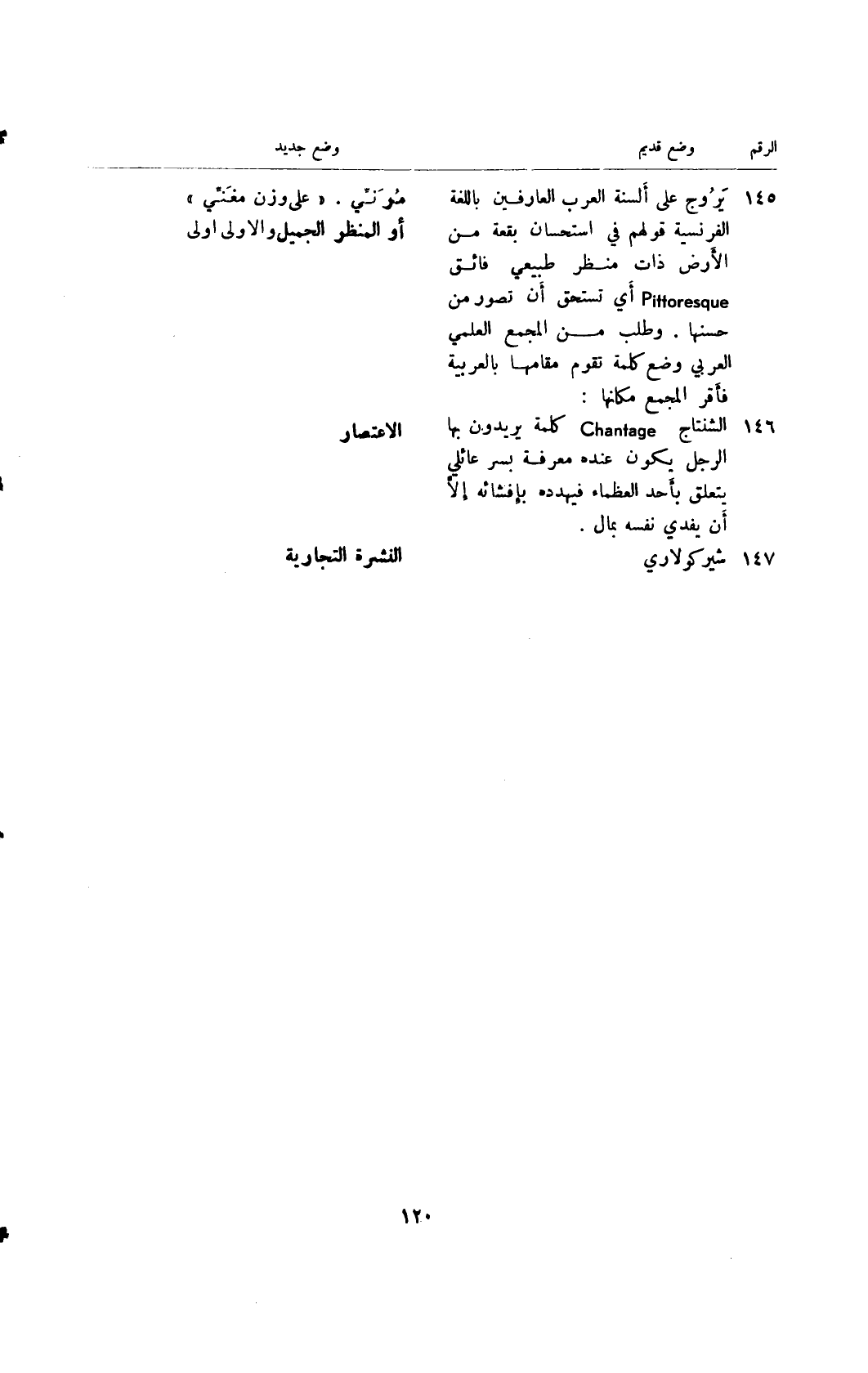 146 ... الشنتاج Chantage كلمة يريدون بها الرجل يكون عنده معرفة بسر عائلي يتعلق بأحد العظماء فيهدده بإفشائه إلا أن يفدي نفسه بمال. ... الاعتصار