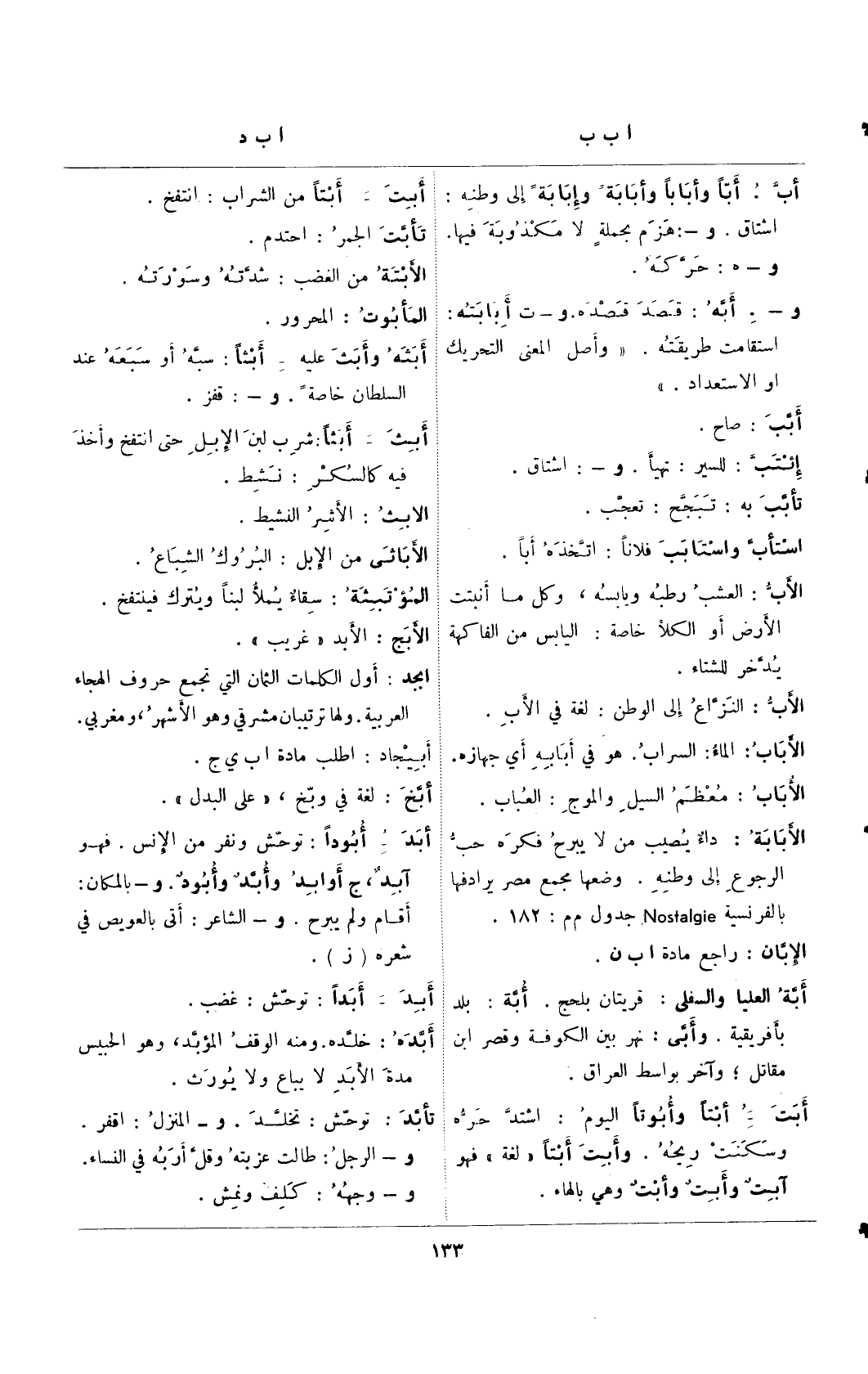 أبد- أبودًا: توحش ونفر من الإنس. فهو آبد، ج أوابد وأبد وأبود. و- بالمكان: أقام ولم يبرح. و- الشاعر: أتى بالعويص في شعره (ز).