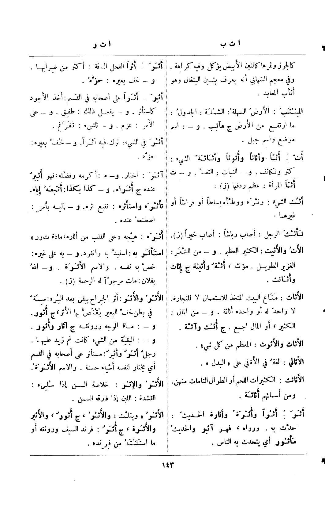 أث: أثًا وأثاثًا وأثوثًا وأثاثة الشيء: كثر وتكاثف. و- النبات: التف. و- ت أثًا المرأة: عظم ردفها (ز).
