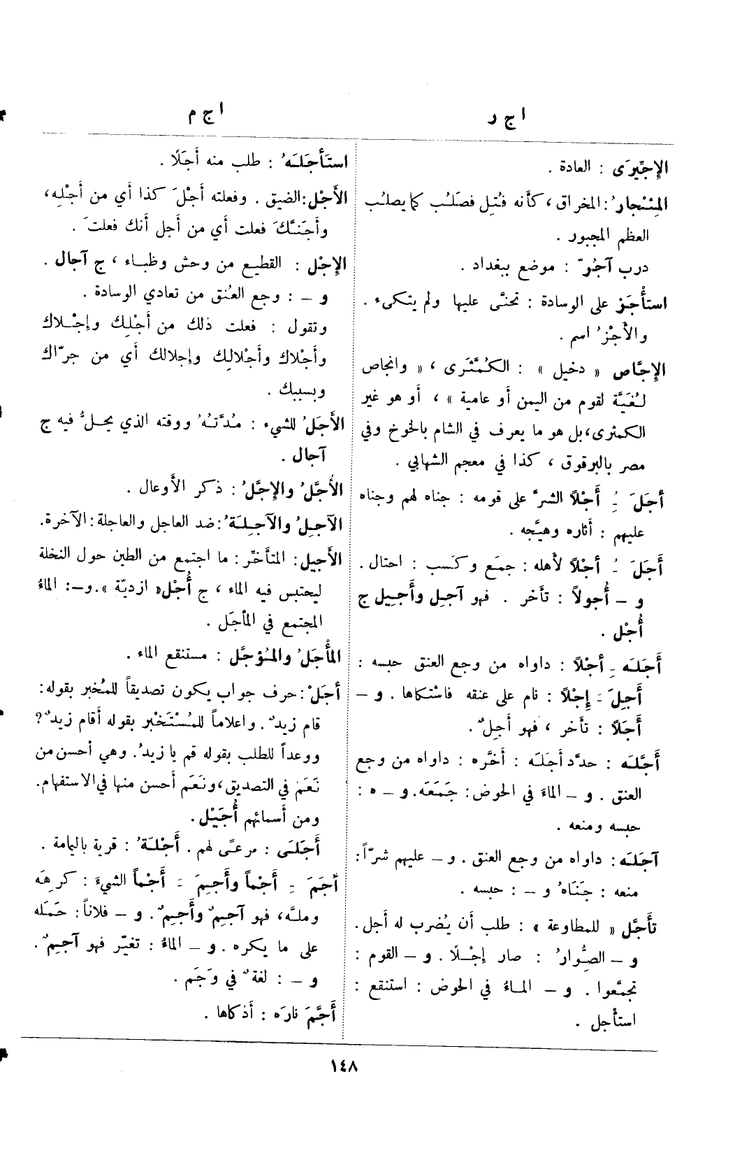 أجلى: مرعى لهم. أجلة: قرية باليمامة. أجم – أجمًا وأجم- أجمًا الشيء: كرهه ومله، فهو آجم وأجم. و- فلانًا: حمله على ما كيره. و- الماء: تغير فهو آجم.