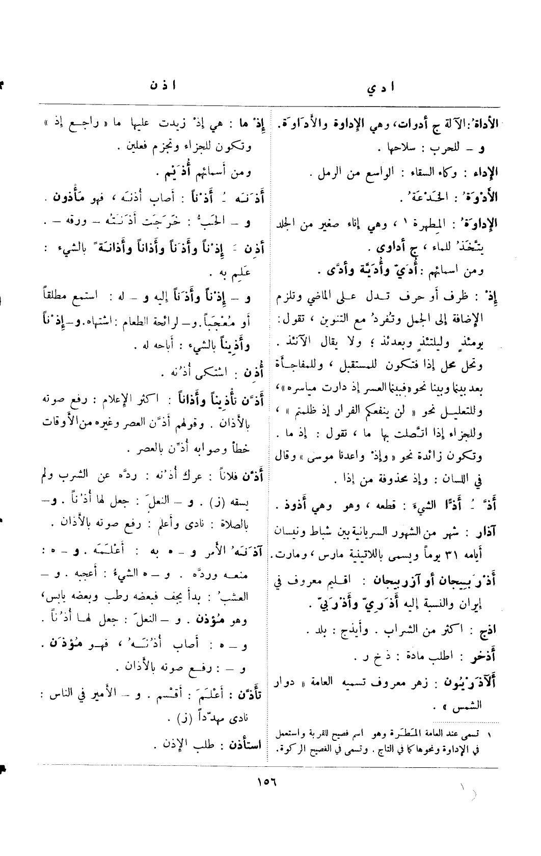 و– إذنًا وأذنًا إليه و – له: استمع مطلقًا أو معجبًا. و – لرائحة الطعام: اشتهاه. و- إذنًا وأذينا بالشيء: أباحه له.