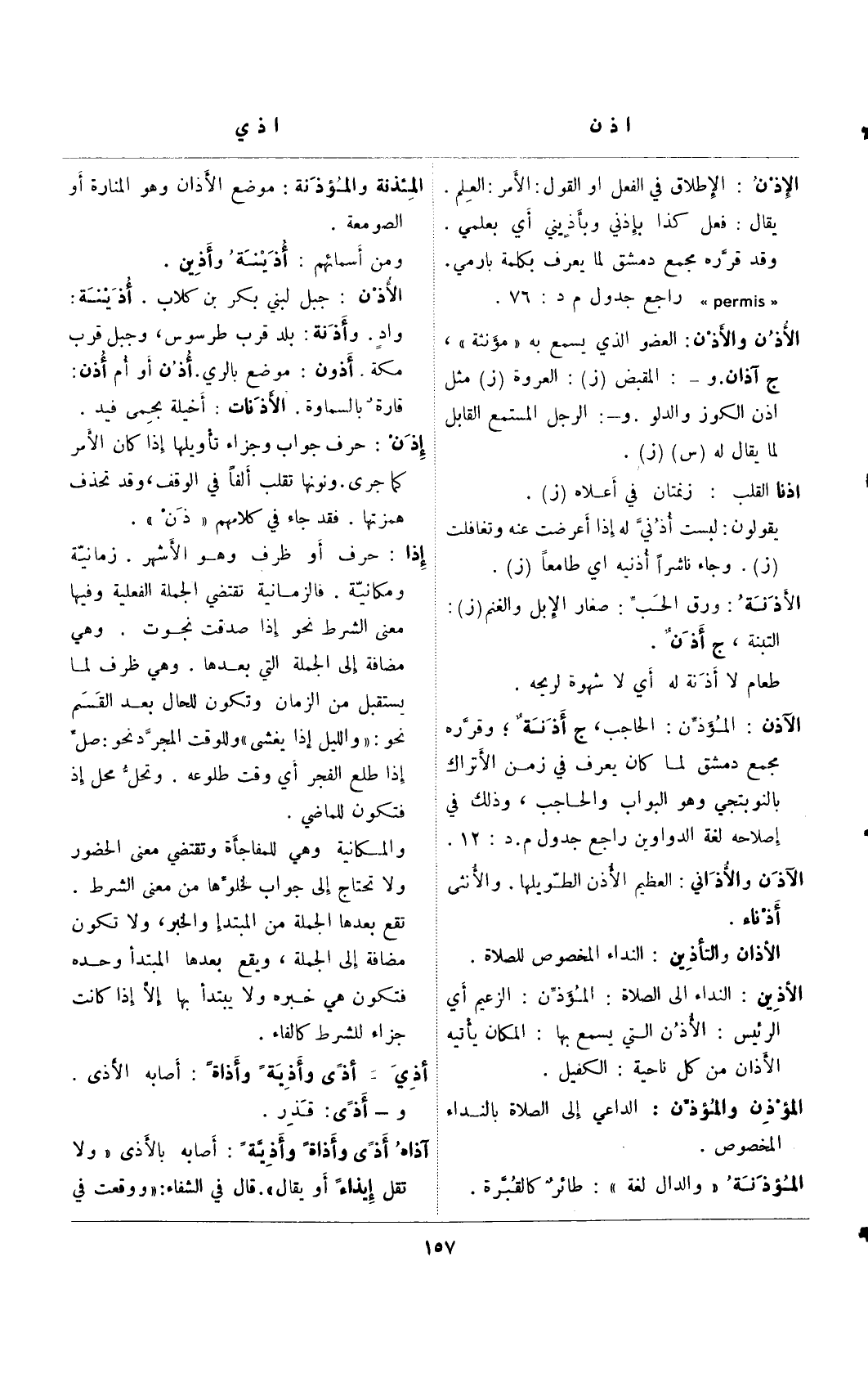 الإذن: الإطلاق في الفعل أو القول: الأمر: العلم. يقال: فعل كذا بإذني وبأذيني أي بعلمي. وقد قرره مجمع دمشق لما يعرف بكلمة بارمي. " permis" راجع جدول م د: 76.