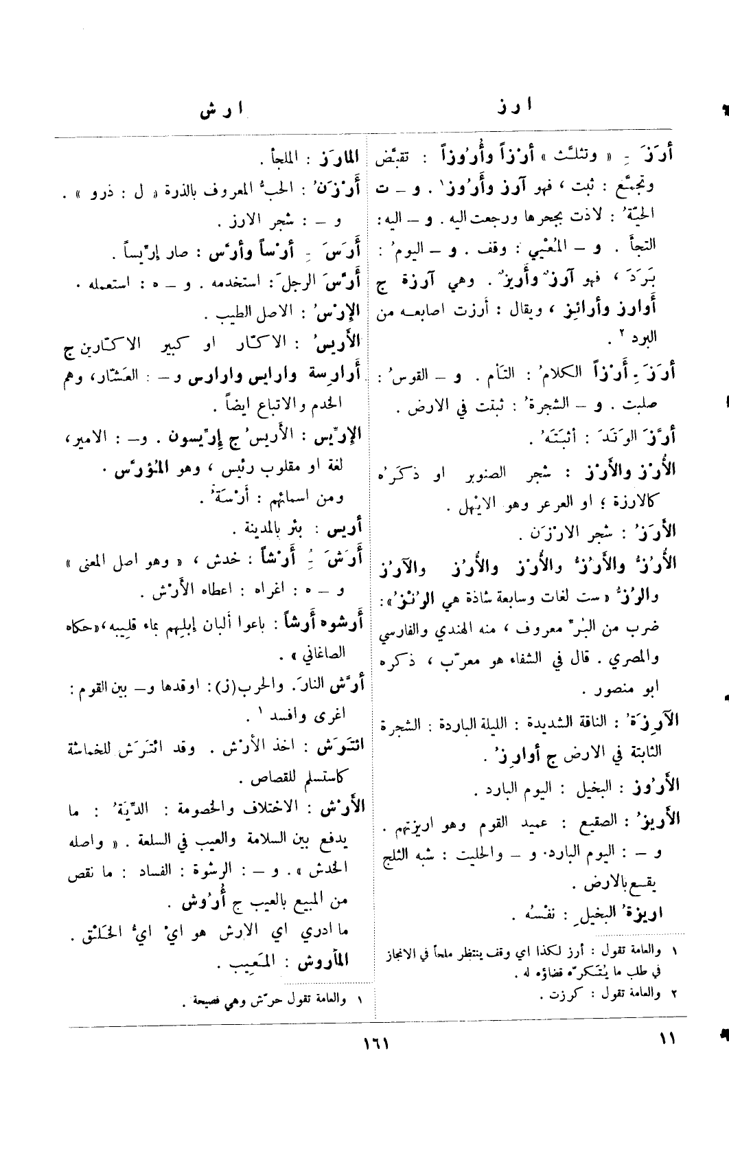 أرز – و"تثلث" أرزًا وأروزًا: تقبض وتجمع: ثبت، فهو آرز وأروز (¬1). و- ت الحية: لاذت بجحرها ورجعت إليهخ. و- إليه: التجأ. و- المعيي: وقف. و- اليوم: برد، فهو آرز واريز. وهي آرزة ج أو أرز وأرائز، ويقال: أرزت أصابعه من البرد (¬2).