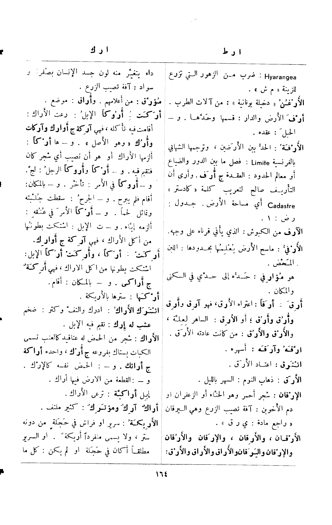 الأرفة: الحد بين الأرضين، وترجمها الشهابي بالفرنسية Limite: فصل ما بين الدور والضياع أو معالم الحدود: العقدة ج ارف. وأرى أن التأريف صالح لتعريب كلمة "كادستر" Cadastre ي مساحة الأرض. جدول: رض: 1.