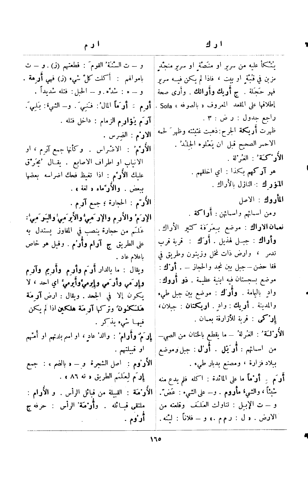 يتكأ عليه من سرير أو منصة أو سرير منجد مزين في قبة أو بيت، فإذا لم يكن فيه سرير فهو حجلة. ج أريك وأرائك. وأرى صحة إطلاقها على المقعد المعروف "بالصوفة" Sofa راجع جدول: رض: 3.