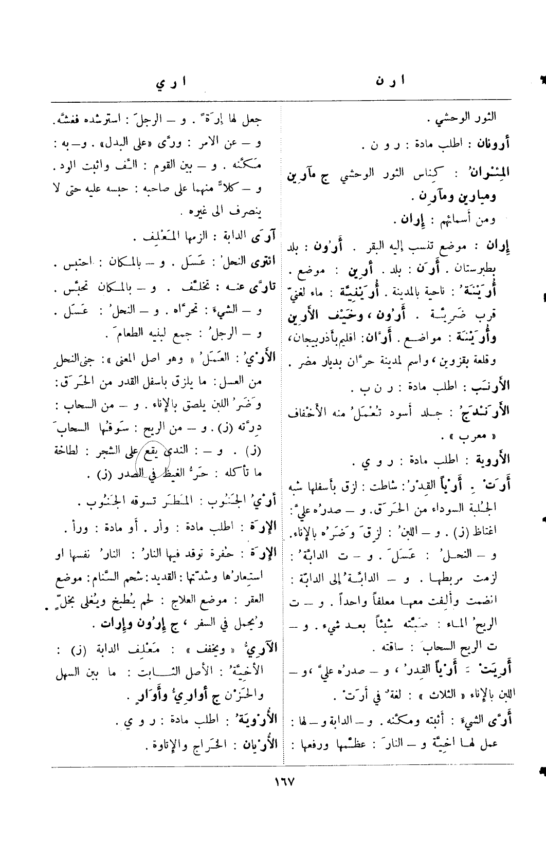 إران: موضع تنسب إليه البقر. أرون: بلد بطبرستان. أرن: بلد. أرين: موضع. أرينة: ناحية بالمدينة. أرينية: ماء لغني قرب ضرية. أرون: وخيف الأرين وأرية: مواضع. أران: إقليم بأذربيجان، وقلعة بقزوين، واسم لمدينة حران بديار مصر.