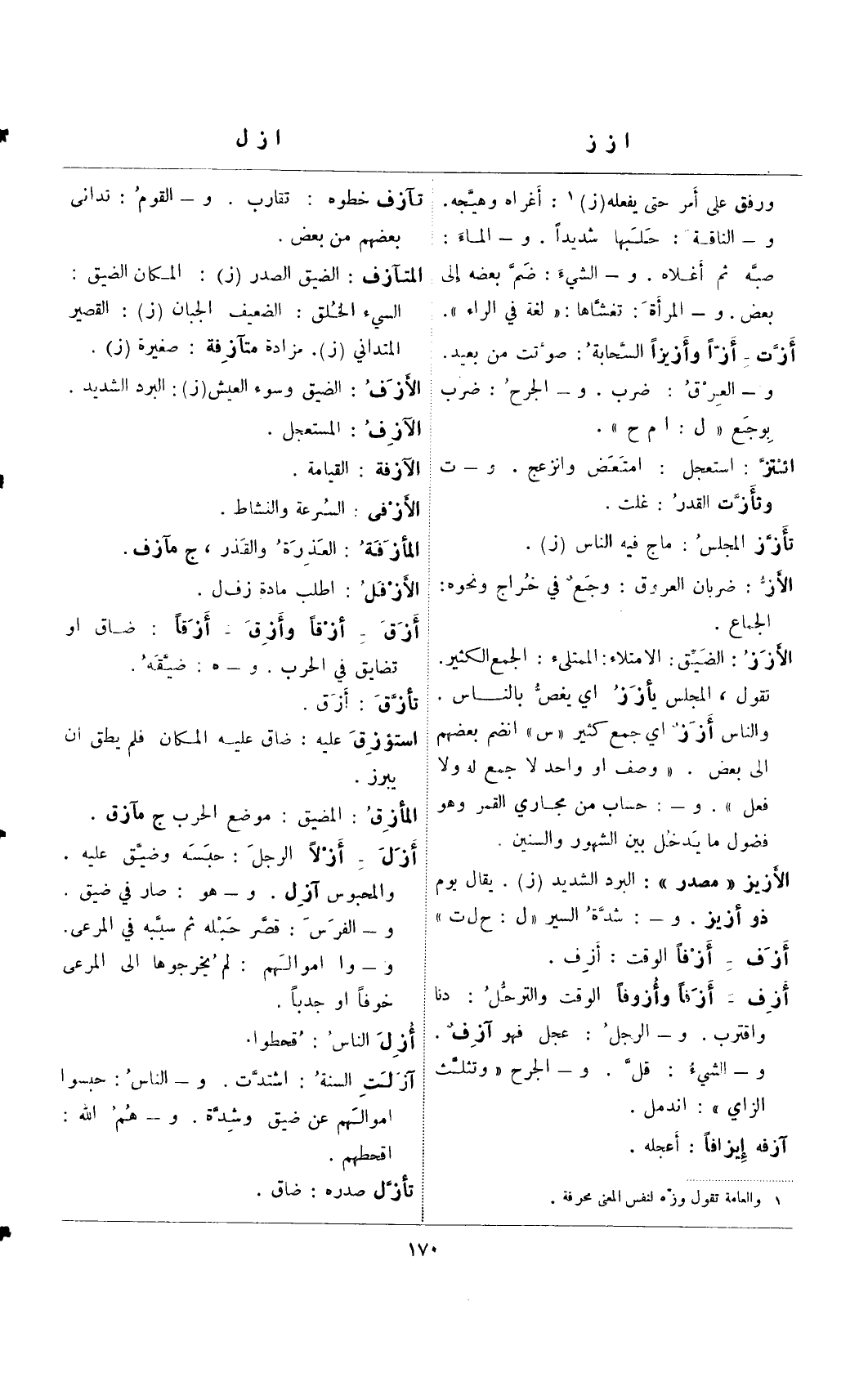 الأزر: الشيق: الامتلاء: الممتلئ: الجمع الكثير. تقول، المجلس يأزر أي يغص بالناس. والناس أزز أي جمع كثير "س" انضم بعضهم إلى بعض. "وصف أو واحد لا جمع له ولا فعل". و-: حساب من مجاري القمر وهو فضول ما يدخل بين الشهور والسنين.