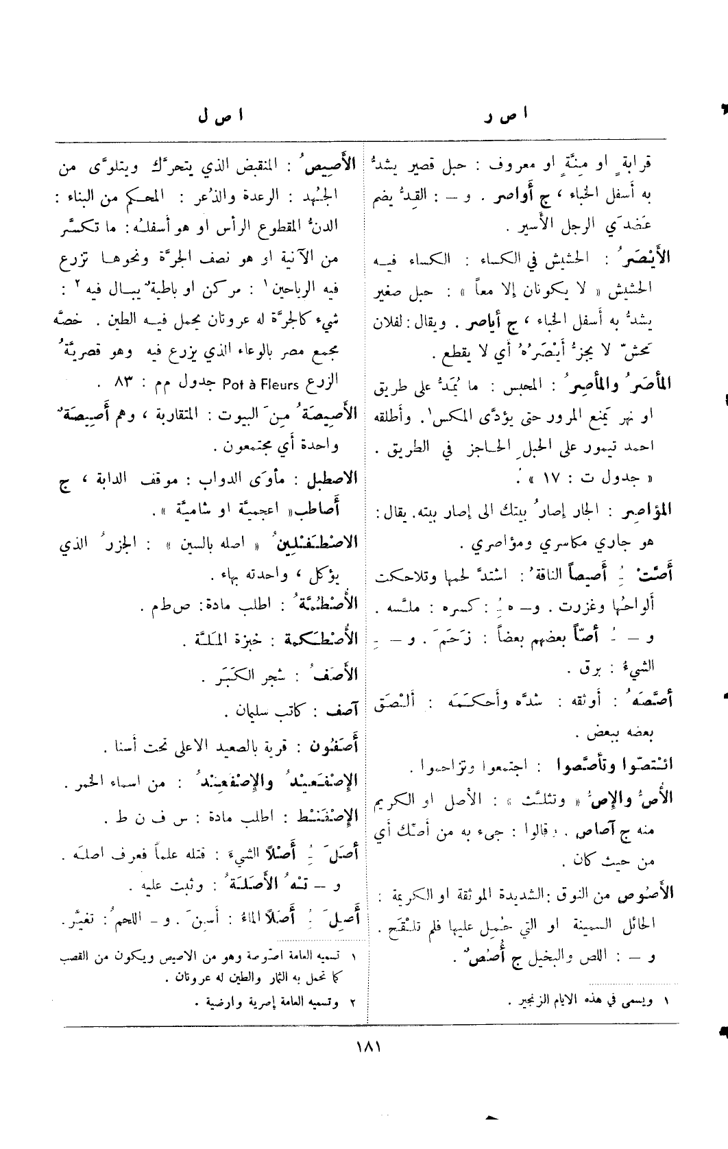 الأصيص: المنقبض الذي يتحرك ويتلوى من الجهد: الرعدة والذعر: المحكم من البناء: الدن المقطوع الرأس أو هو أسفله: ما تكسر من الآنية أو هو نصف الجرة ونحوها تزرع فيه الرياحين (¬2): مركن أو باطية يبال فيه (¬3): شيء كالجرة له عروتان يحمل فيه الطين. خصه مجمع مصر بالوعاء الذي يزرع فيه وهو قصرية الزرع pot a Fleurs جدول م م: 83.