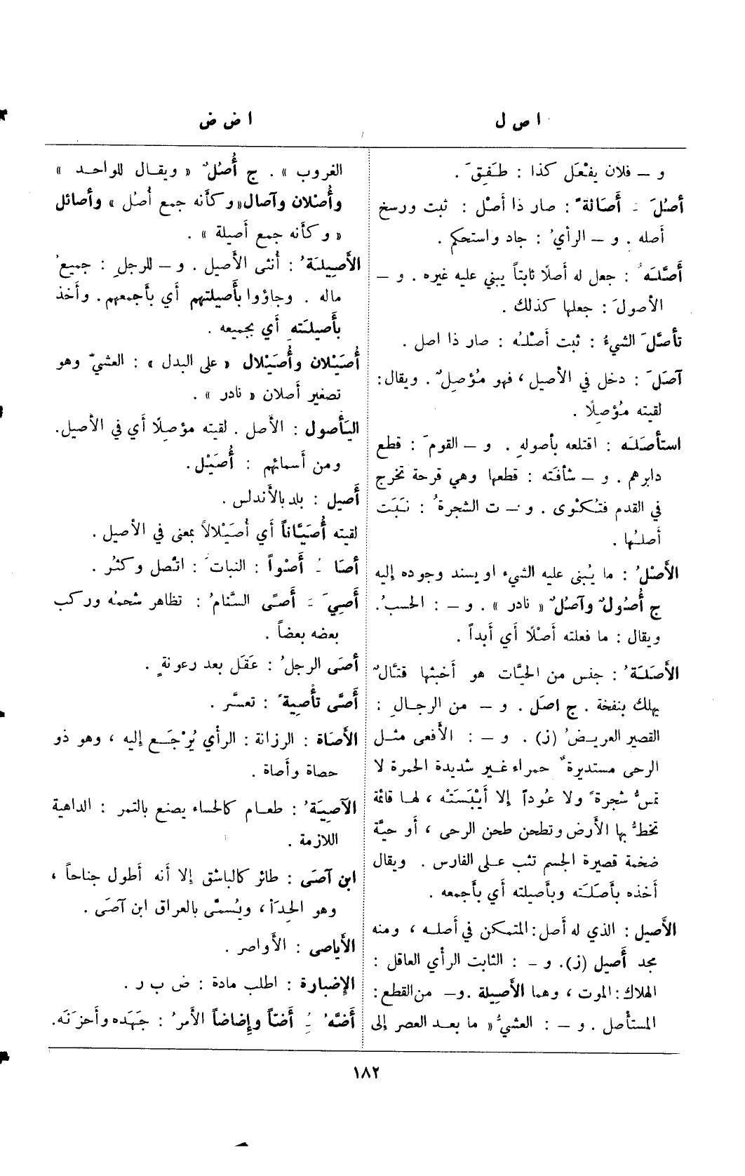 الأصل: الذي له أصل: المتمكن في أصله، ومنه مجد أصيل (ز). و-: الثابت الرأي العاقل: الهلاك: الموت، وهما الأصيلة. و- من القطع: المستأصل. و- العشي " ما بعد العصر إلي