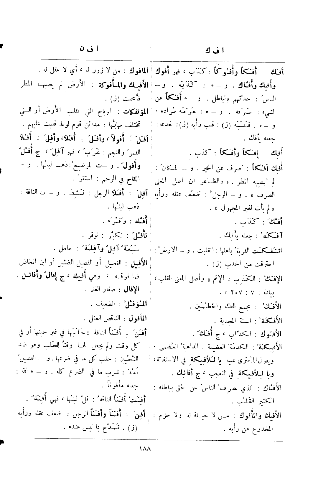 أفك- أفكًا وأفوكًا: كذب، فهو أفوك وأفيك وأفاك. و-هـ: كذبه. و- الناس: حدثهم بالباطل. و- هـ أفكًا عن الشيء: صرفه. و-هـ: حرمه مراده. و-هـ: قلبه (ز): قلب رأيه (ز): خدعه: جعله يأفك.