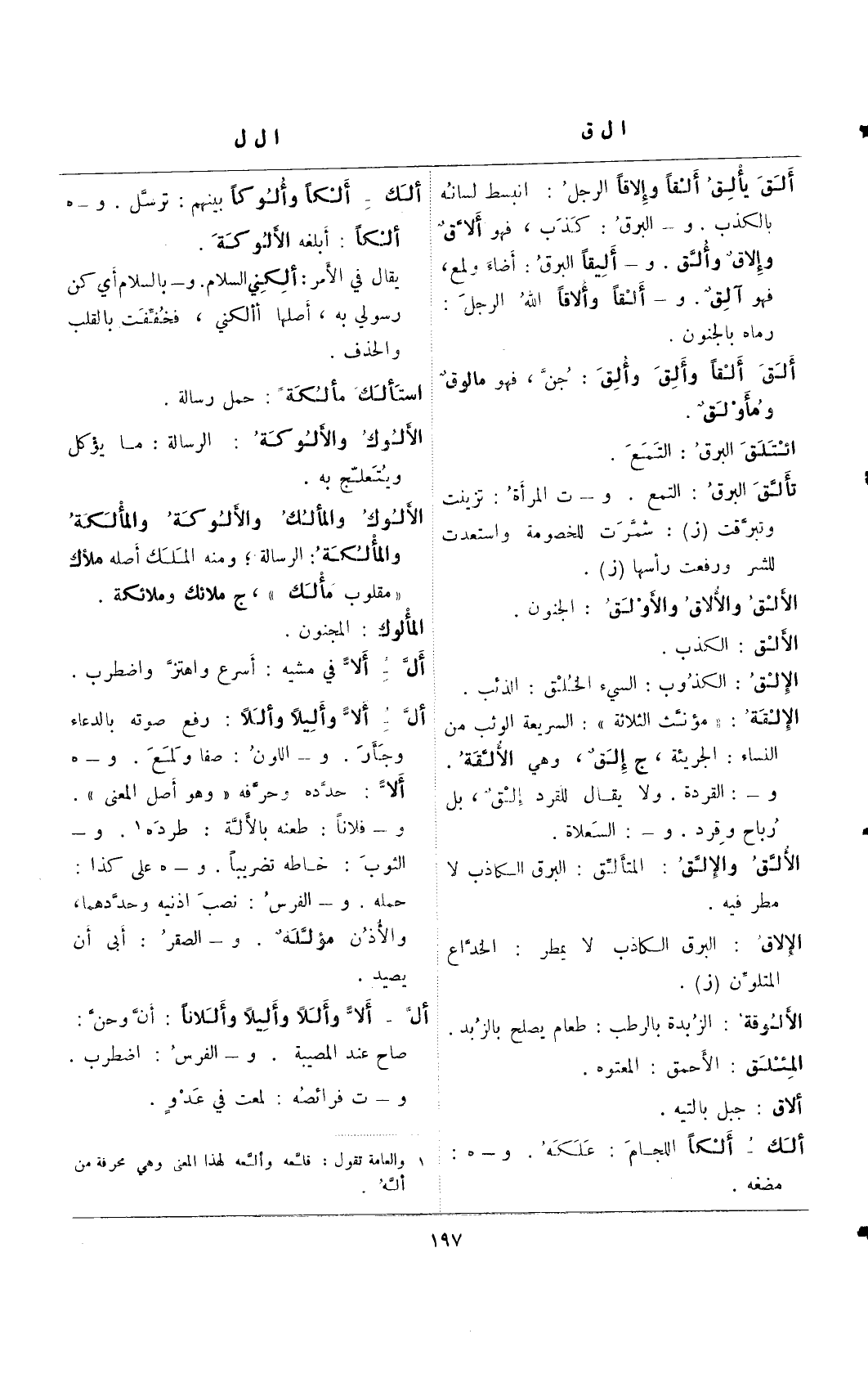 أل- ألا واليلًا وأللًا: رفع صوته بالدعاء وجأر. و- اللون: صفا ولمع. و- هـ ألا: حدده وحرفه "وهو أصل المعنى".
