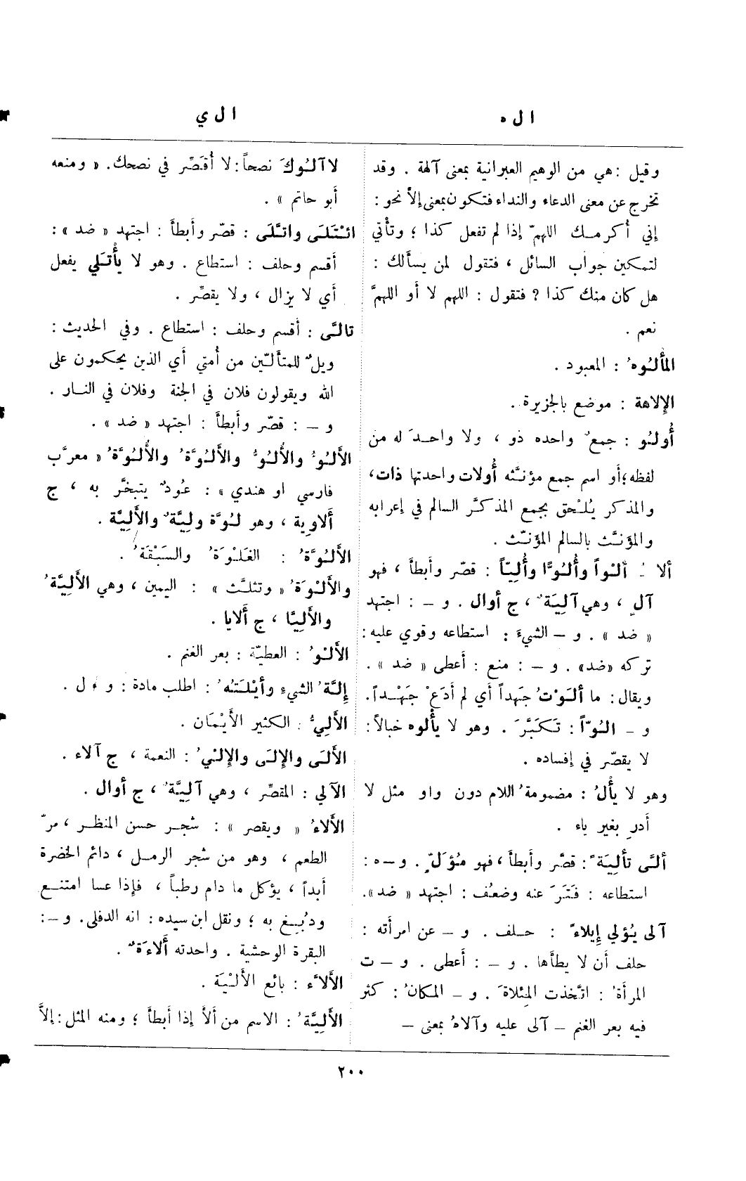 ألا- ألوًا وألوًا وأليًا: قصر وأبطأ، فهو آل، وهي آلية، ج أوال. و-: اجتهد "ضد". و- الشيء: استطاعه وقوى عليه: تركه "ضد". و-: منع: أعطى "ضد".