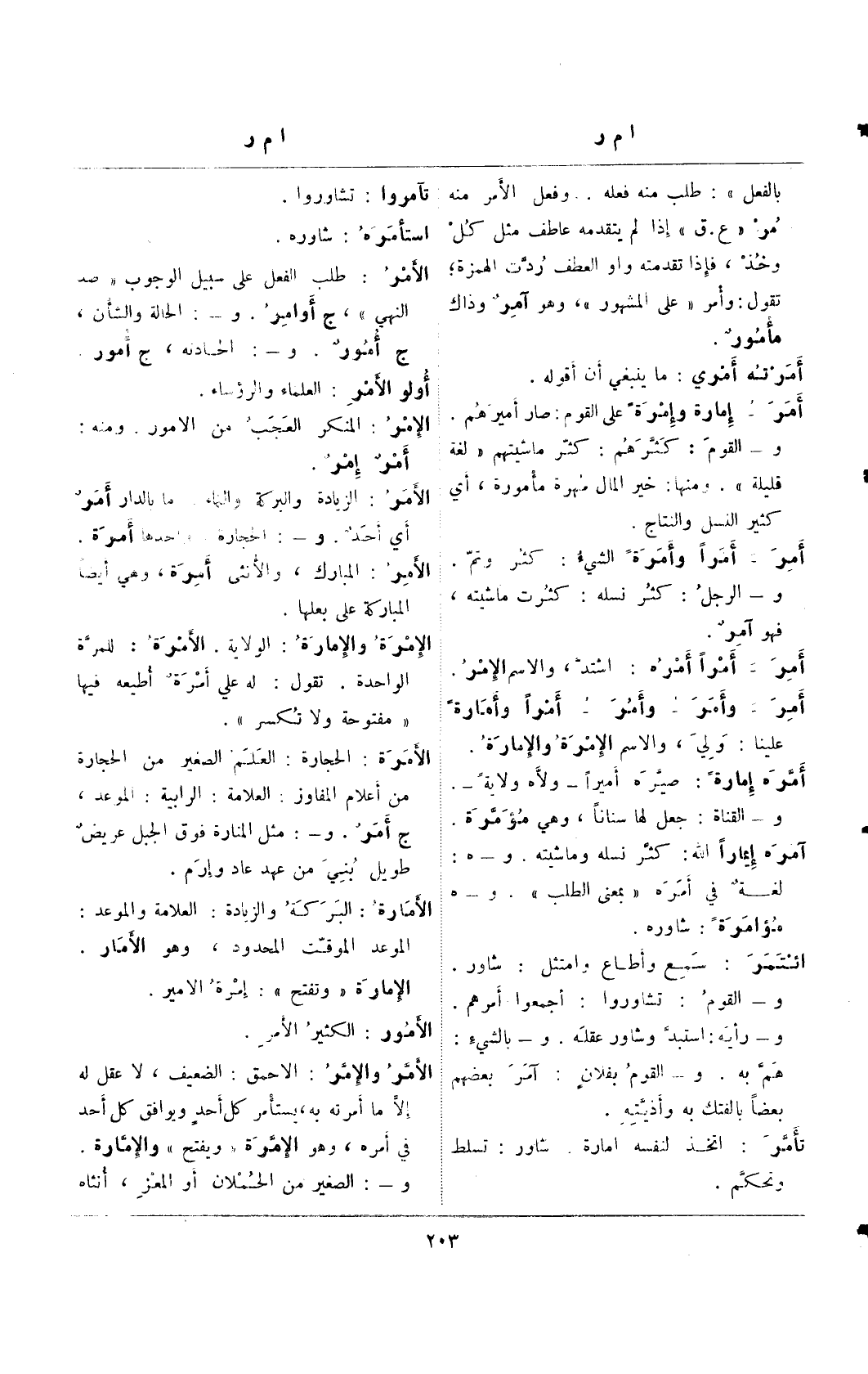 الأمر: الزيادة والبركة والنماء. ما بالدار أمر أي أحد. و-: الحجارة واحدها أمره.