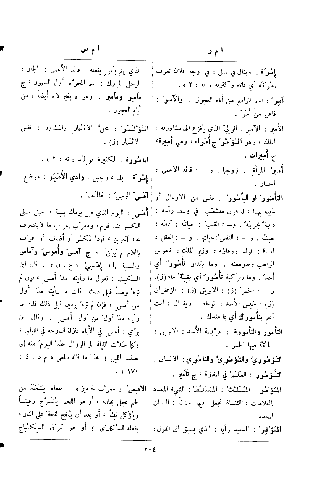التأمور أو اليأمور: جنس من الاوعال أو شبيه بها، له قرن متشعب في وسط رأسه: دابة بحرية. و-: القلب: حياته: دمه: حبته. و-: النفس: حياتها. و-: العقل: الماء: الولد ووعاؤه: وزير الملك: ناموس الراهب وصومعته. وما بالدار تأمور أي أحد. وما بالركية تأمور أي بقية ماء (ز). و-: الخمر (ز): الابريق (ز): الزعفران (ز): خيس الأسد: الوعاء. ويقال: انت أعلم بتأمورك أي بما عندك.