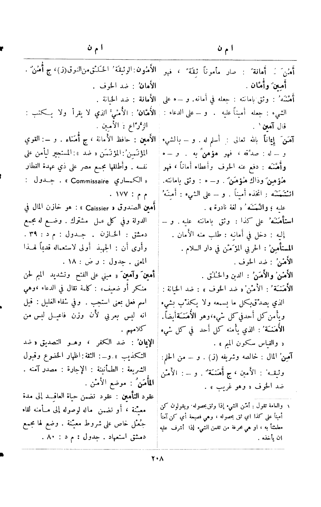(¬1) والعامة تقول: أمن الشيء إذا وثق بحصوله. ويقولون كن أمينا على كذا أي ثق بحصوله، وهي فصيحة أي كن آمنا مطمئنا به، أو هي محرفة من تقمن الشيء إذا أشرف عليه إن يأخذه.