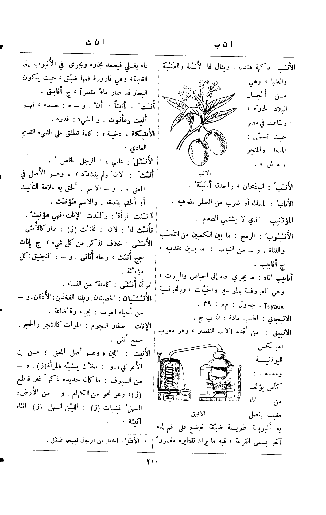 الانبيق: من أقدم آلات التقطير، وهو معرب امبكس اليونانية ومعناها: كأس يؤلف من اناء مقبب يتصل به أنبوبة طويلة ضيقة توضع على فم إناء آخر يسمى القرعة، فيه ما يراد تقطيره مغمورًا بماء يغلي فيصعد بخاره ويجري في الأنبوب إلى القابلة، وهي قارورة فمها ضيق، حيث يكون البخار قد صار ماء مقطرًا، ج أنابيق.