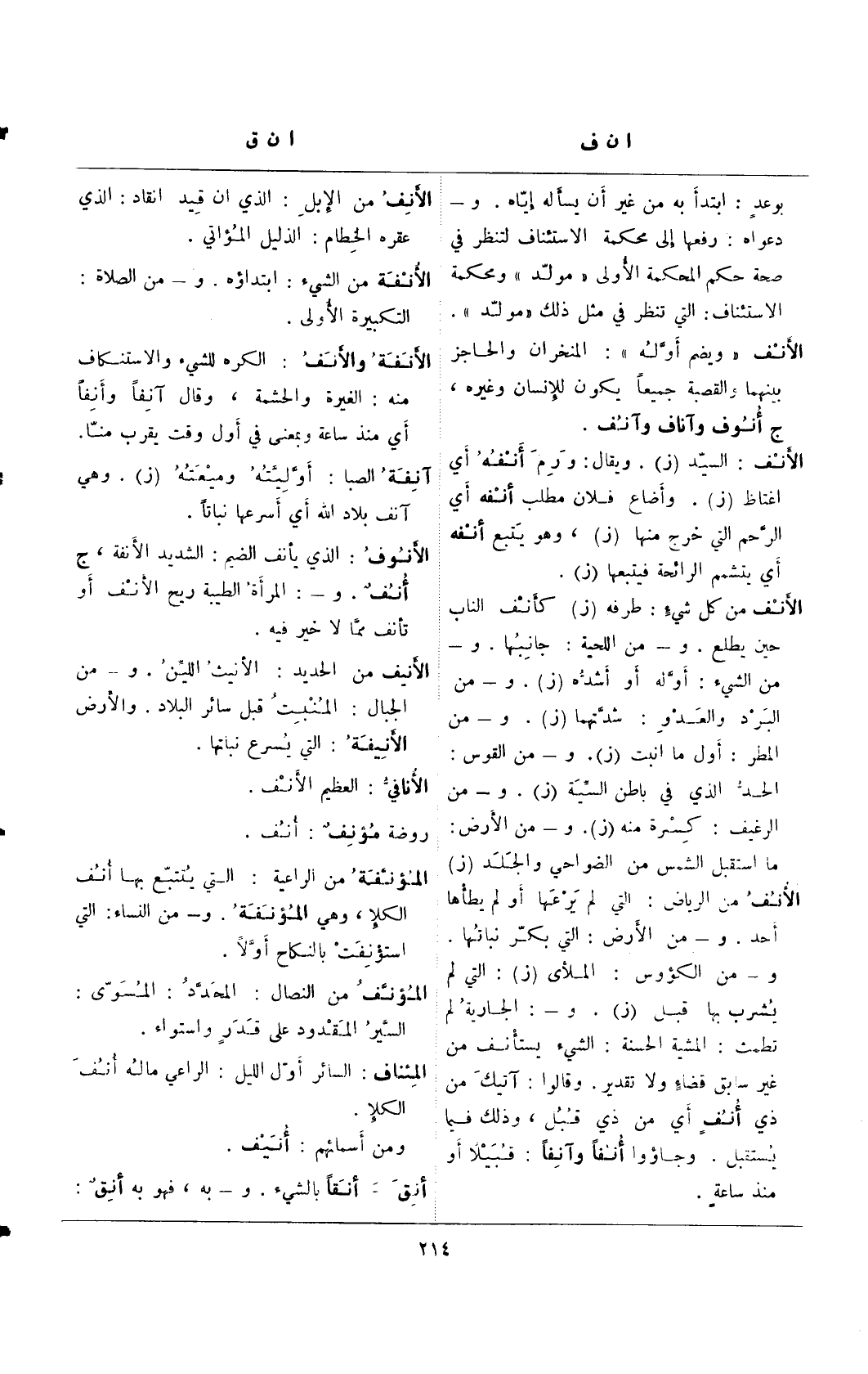 الأنف من الرياض: التي لم يرعها أو لم يطأها أحد. و- من الأرض: التي بكر نباتها. و- من الكؤوس: الملأى (ز): التي لم يشرب بها قبل (ز). و-: الجارية لم تطمث: المشية الحسنة: الشيء يستظانف من غير سابق قضاء ولا تقدير. وقالوا: آتيك من ذي أنف أي من ذي قبل، وذلك فيما يستقبل. وجاؤوا أنفًا وآنفا: قبيلا او منذ ساعة.