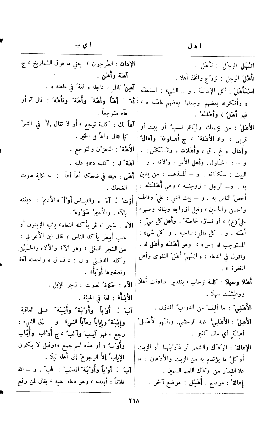 الأهل: من يجمعك وإياهم نسب أو بيت أو قربي، وهم الأهلة، ج أهلون وآهال وأهال "غ. ق" وأهلات "وتسكن". و-: الحلول. وأهل الأمر: ولاته. و- البيت: سكانه. و- المذهب: من يدين به. و- الرجل: زوجته، وهي أهلته: اخص الناس به. و- بيت النبي: علي وفاطمة والحسن والحسين، وقيل أرواجه وبناته وصهره علي (ع)، أو نساؤه خاصة. وأهل كل نبي: أمته. و- كل مال: صاحبه. و- كل شيء: المستوجب له "س"، وهو أهله وأهل له. وتقول في الدعاء: "اللهم أهل التقوى وأهل المغفرة".