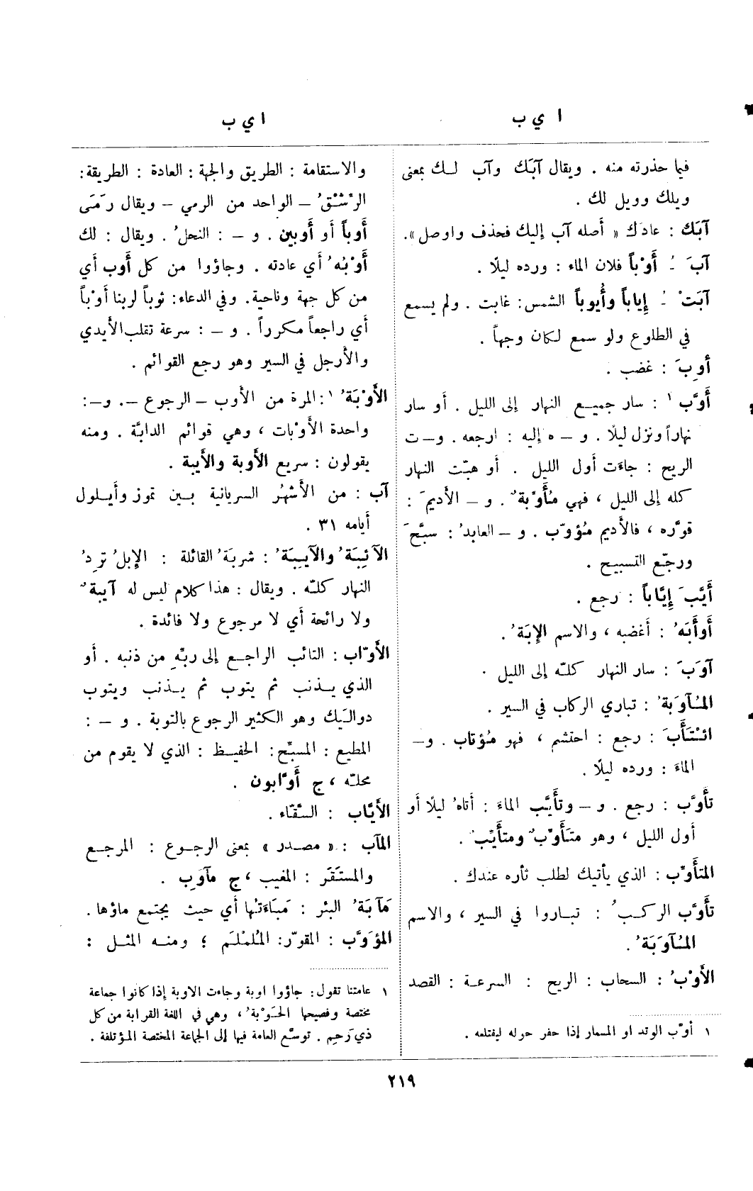 أوب (¬1): سار جميع النهار إلى الليل. أو سار نهارًا ونزل ليلًا. و-هـ إليه: ارجعه. و- ت الريح: جاءت أول الليل. أوهبت النهار كله إلى الليل، فهي مأوبة. و- الأديم: قوره، فالأديم مؤوب. و- العابد: سبح ورجع التسبيح.