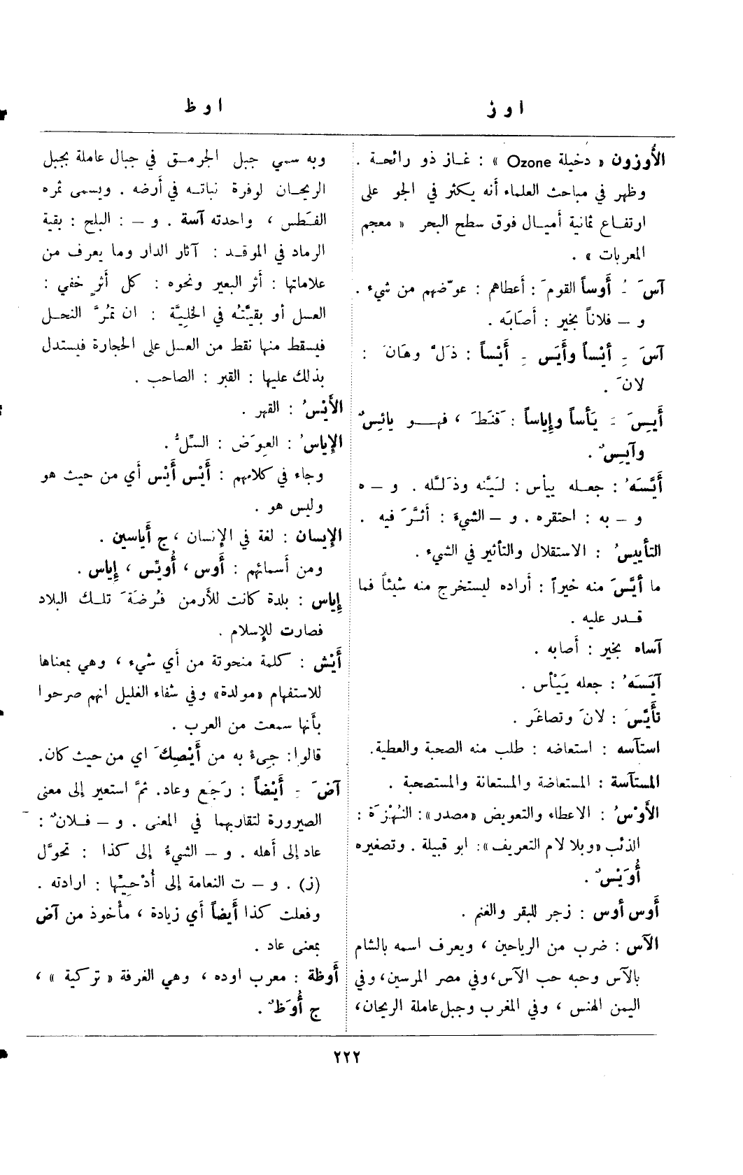 الأوزون "دخيلة Ozone": غاز ذو رائحة وظهر في مباحث العلماء أنه يكثر في الجو على ارتفاع ثمانية أميال فوق سطح البحر "معجم المعربات".